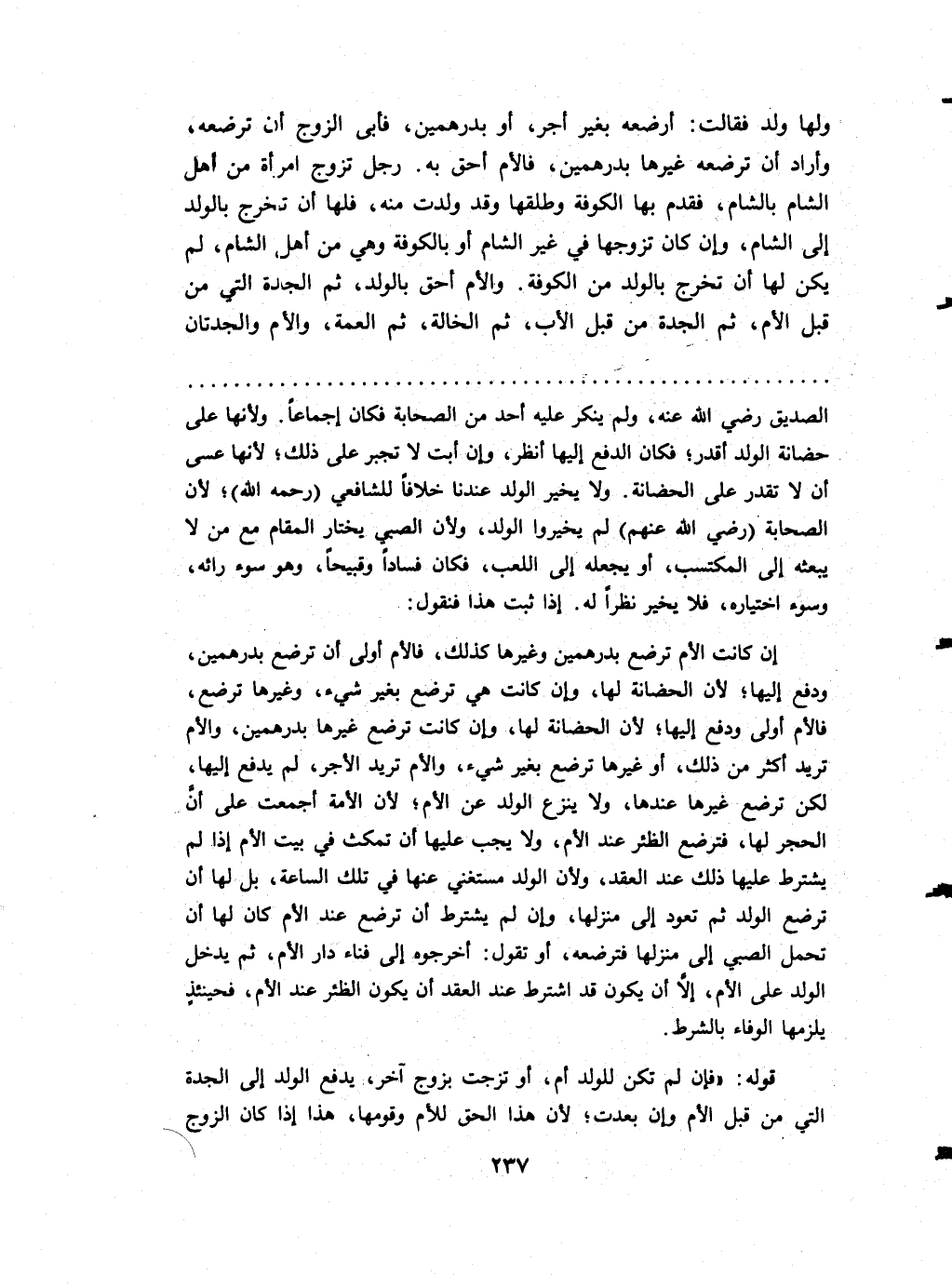 وَلها ولد فَقَالَت أرضعه بِغَيْر أجر أَو بدرهيمن فَأبى الزَّوْج أَن ترْضِعه وَأَرَادَ أَن ترْضِعه غَيرهَا بِدِرْهَمَيْنِ فالأم أَحَق بِهِ رجل تزوج امْرَأَة من أهل الشَّام بِالشَّام فَقدم بهَا الْكُوفَة وَطَلقهَا وَقد ولدت مِنْهُ فلهَا أَن تخرج بِالْوَلَدِ إِلَى الشَّام وَإِن كَانَ تزَوجهَا فِي غير الشَّام أَو بِالْكُوفَةِ وَهِي من أهل الشَّام لم يكن لَهَا أَن تخرج بِالْوَلَدِ من الْكُوفَة وَالأُم أَحَق بِالْوَلَدِ ثمَّ الْجدّة الَّتِي من قبل الْأُم ثمَّ الْجدّة من قبل الْأَب ثمَّ الْخَالَة ثمَّ الْعمة والام والجدتان