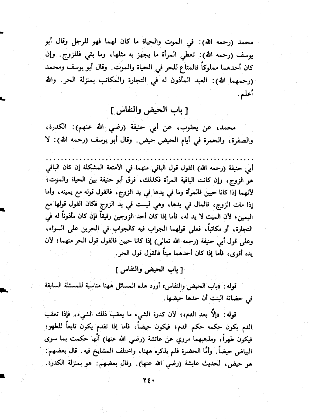 مُحَمَّد (رَحمَه الله) فِي الْمَوْت والحياة مَا كَانَ لَهما فَهُوَ للرجل وَقَالَ أَبُو يُوسُف (رَحمَه الله) تُعْطِي الْمَرْأَة مَا يُجهز بِهِ مثلهَا وَمَا بَقِي فَللزَّوْج وَإِن كَانَ أَحدهمَا مَمْلُوكا فالمتاع للْحرّ فِي الْحَيَاة وَالْمَوْت وَقَالَ أَبُو يُوسُف وَمُحَمّد (رحمهمَا الله) العَبْد الْمَأْذُون لَهُ فِي التِّجَارَة وَالْمكَاتب بِمَنْزِلَة الْحر وَالله أعلم