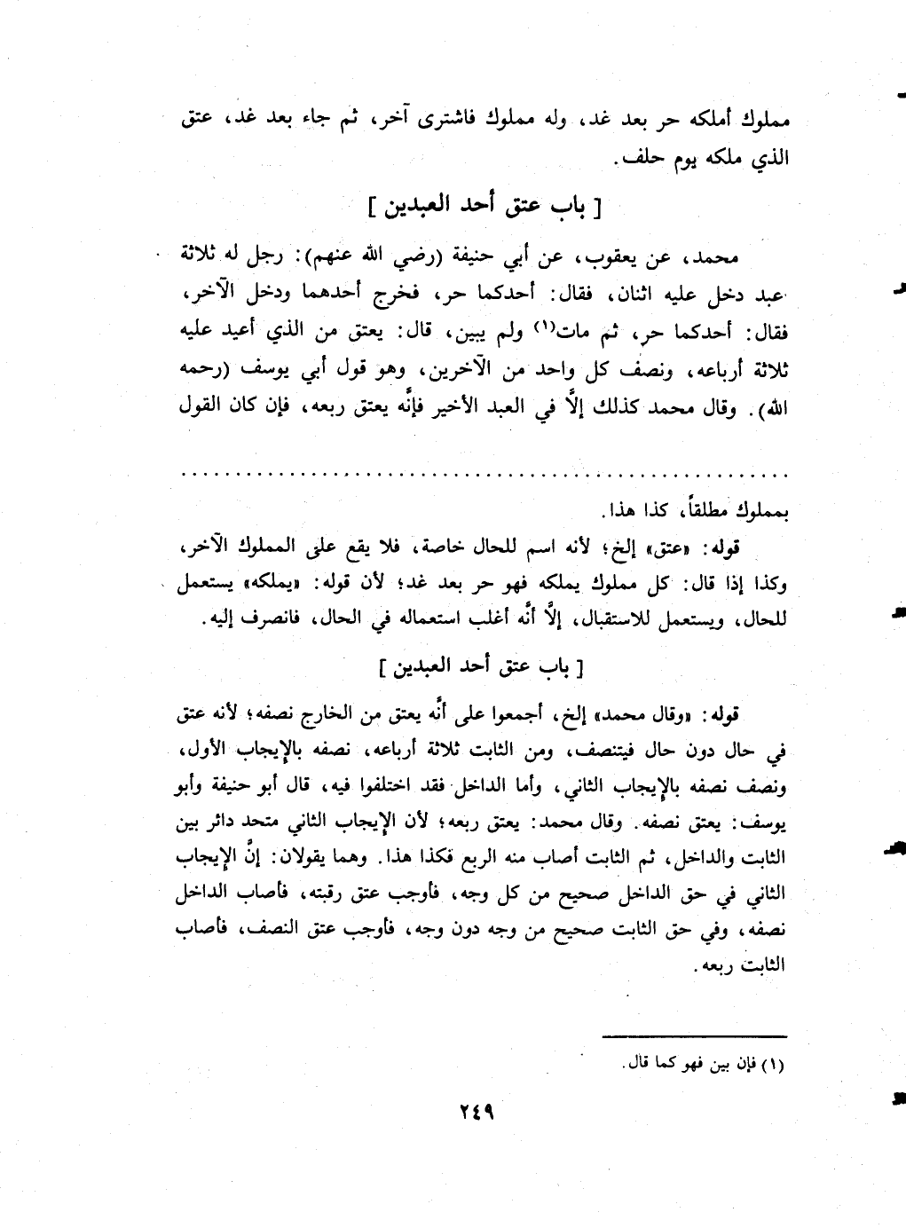 مُحَمَّد عَن يَعْقُوب عَن أبي حنيفَة (رَضِي الله عَنْهُم) رجل لَهُ ثَلَاثَة عبد دخل عَلَيْهِ اثْنَان فَقَالَ أَحَدكُمَا حر فَخرج أَحدهمَا وَدخل الآخر فَقَالَ أَحَدكُمَا حر ثمَّ مَاتَ وَلم يبين قَالَ يعْتق من الَّذِي أُعِيد عَلَيْهِ ثَلَاثَة أَرْبَاعه وَنصف كل وَاحِد من الآخرين وَهُوَ قَول أبي يُوسُف (رَحمَه الله) وَقَالَ مُحَمَّد كَذَلِك إِلَّا فِي العَبْد الْأَخير فَإِنَّهُ يعْتق ربعه فَإِن كَانَ القَوْل