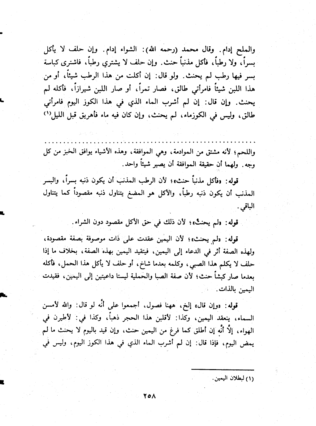 وَالْملح إدام وَقَالَ مُحَمَّد رَحمَه الله الشواء إدام وَإِن حلف لَا يَأْكُل بسراً وَلَا رطبا فَأكل مذنبا حَنش وَإِن حلف لَا يَشْتَرِي رطبا فَاشْترى كباسة بسر فِيهَا رطب لم يَحْنَث وَلَو قَالَ إِن أكلت من هَذَا الرطب شَيْئا أَو من هَذَا البن شَيْئا فامرأتي طَالِق فَصَارَ تَمرا أَو صَار اللَّبن شيرازاً فَأَكله لم يَحْنَث وَإِن قَالَ إِن لم أشْرب المَاء الَّذِي فِي هَذَا الْكوز الْيَوْم فامرأتي طَالِق وَلَيْسَ فِي الْكوز مَاء لم يَحْنَث وَإِن كَانَ فِيهِ مَاء فأهريق قبل اللَّيْل
