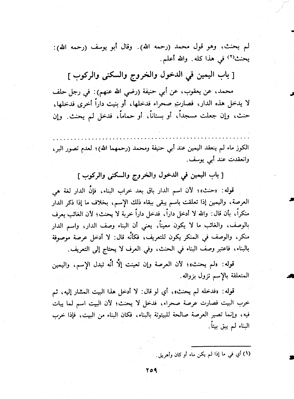 مُحَمَّد عَن يَعْقُوب عَن أبي حنيفَة (رَضِي الله عَنْهُم) فِي رجل حلف لَا يدْخل هَذِه الدَّار فَصَارَت صحراء فَدَخلَهَا أَو بنيت دَارا أُخْرَى فَدَخلَهَا حنث وَإِن جعلت مَسْجِدا أَو بستاناً أَو حَماما فَدخل لم يَحْنَث وَإِن