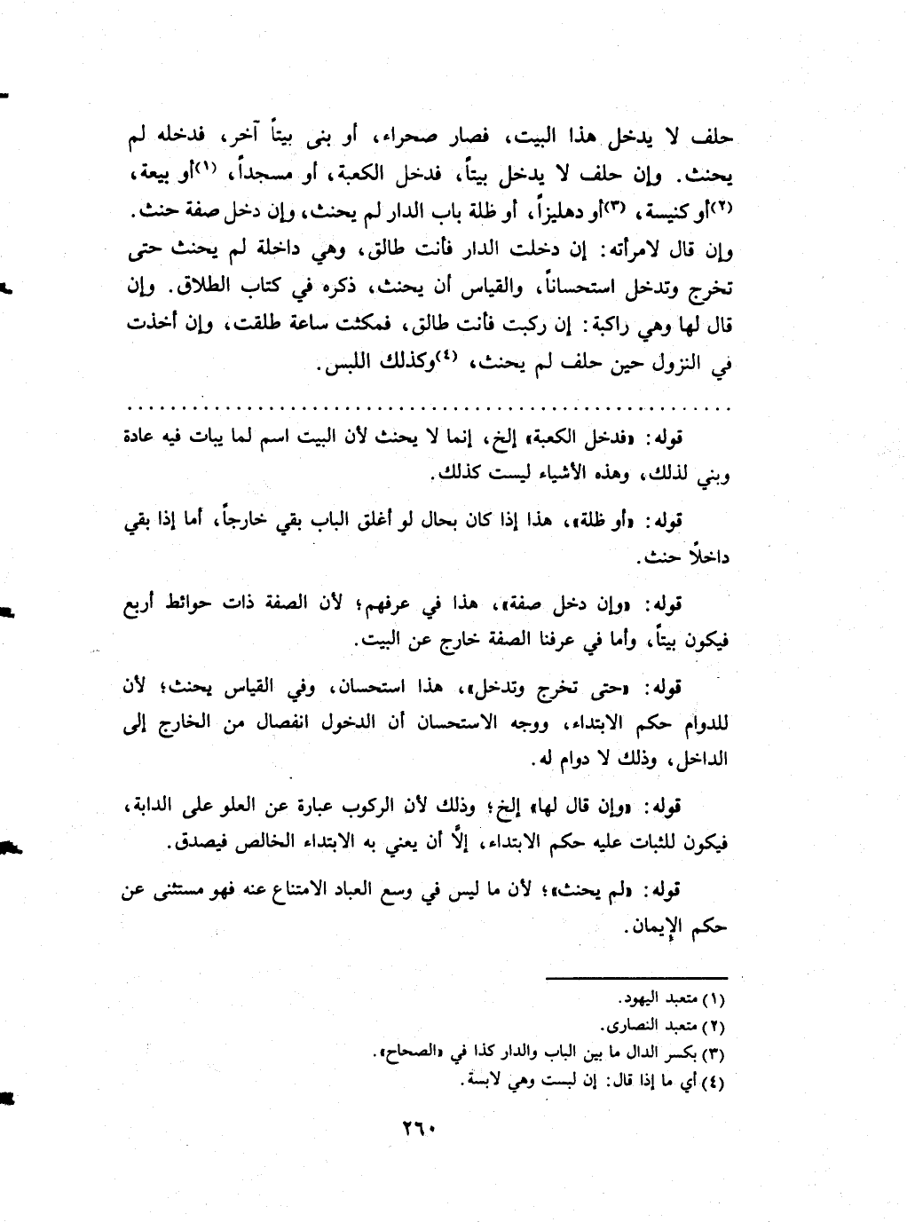 حلف لَا يدْخل هَذَا الْبَيْت فَصَارَ صحراء أَو بنى بَيْتا آخر فدخله لم يَحْنَث وَإِن حلف لَا يدْخل بَيْتا فَدخل الْكَعْبَة أَو مَسْجِدا أَو بيعَة أَو كَنِيسَة أَو دهليزاً أَو ظلة بَاب الدَّار لم يَحْنَث وَإِن دخل صفة حنث وَإِن قَالَ لامْرَأَته إِن دخلت الدَّار فَأَنت طَالِق وَهِي دَاخِلَة لم يَحْنَث حَتَّى تخرج وَتدْخل اسْتِحْسَانًا وَالْقِيَاس أَن يَحْنَث ذكره فِي كتاب الطَّلَاق وَإِن قَالَ لَهَا وَهِي راكبة إِن ركبت فَأَنت طَالِق فَمَكثت سَاعَة طلقت وَإِن أخذت فِي النُّزُول حِين حلف لم يَحْنَث وَكَذَلِكَ اللّبْس
