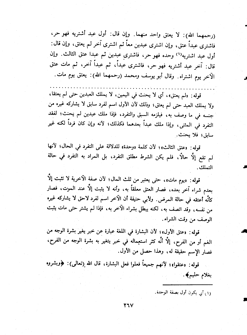(رحمهمَا الله) لَا يعْتق وَاحِد مِنْهُمَا وَإِن قَالَ أول عبد أشتريه فَهُوَ حر فَاشْترى عبدا عتق وَإِن اشْترى عَبْدَيْنِ مَعًا ثمَّ اشْترى آخر لم يعْتق وَإِن قَالَ أول عبد أشتريه وَحده فَهُوَ حر فَاشْترى عَبْدَيْنِ ثمَّ عبدا عتق الثَّالِث وَإِن قَالَ آخر عبد أشتريه فَهُوَ حر فَاشْترى عبدا ثمَّ عبدا آخر ثمَّ مَاتَ عنق الآخر يَوْم اشْتَرَاهُ وَقَالَ أَبُو يُوسُف وَمُحَمّد (رحمهمَا الله) يعْتق يَوْم مَاتَ