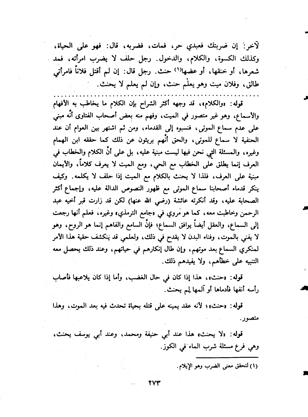 لآخر إِن ضربتك فَعَبْدي حر فَمَاتَ فَضَربهُ قَالَ فَهُوَ على الْحَيَاة وَكَذَلِكَ الْكسْوَة وَالْكَلَام وَالدُّخُول رجل حلف لَا يضْرب امْرَأَته فَمد شعرهَا أَو خنقها أَو عضها حنث رجل قَالَ إِن لم أقتل فلَانا فامرأتي طَالِق وَفُلَان ميت وَهُوَ يعلم حنث وَإِن لم يعلم لَا يَحْنَث