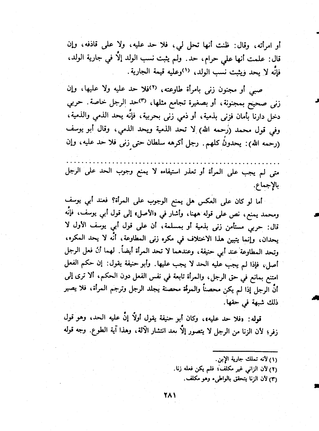 صبي أَو مَجْنُون زنى بِامْرَأَة طاوعته فَلَا حد عَلَيْهِ وَلَا عَلَيْهَا وَإِن زنى صَحِيح بمجنونة أَو بصغيرة تجامع مثلهَا حد الرجل خَاصَّة حَرْبِيّ دخل دَارنَا بِأَمَان فزنى بذمية أَو ذمِّي زنى بحربية فَإِنَّهُ يحد الذمى والذمية وَفِي قَول مُحَمَّد (رَحمَه الله) لَا تحد الذِّمِّيَّة وَيحد الذِّمِّيّ وَقَالَ أَبُو يُوسُف (رَحمَه الله) يحدون كلهم رجل أكرهه سُلْطَان حَتَّى زنى فَلَا حد عَلَيْهِ وان