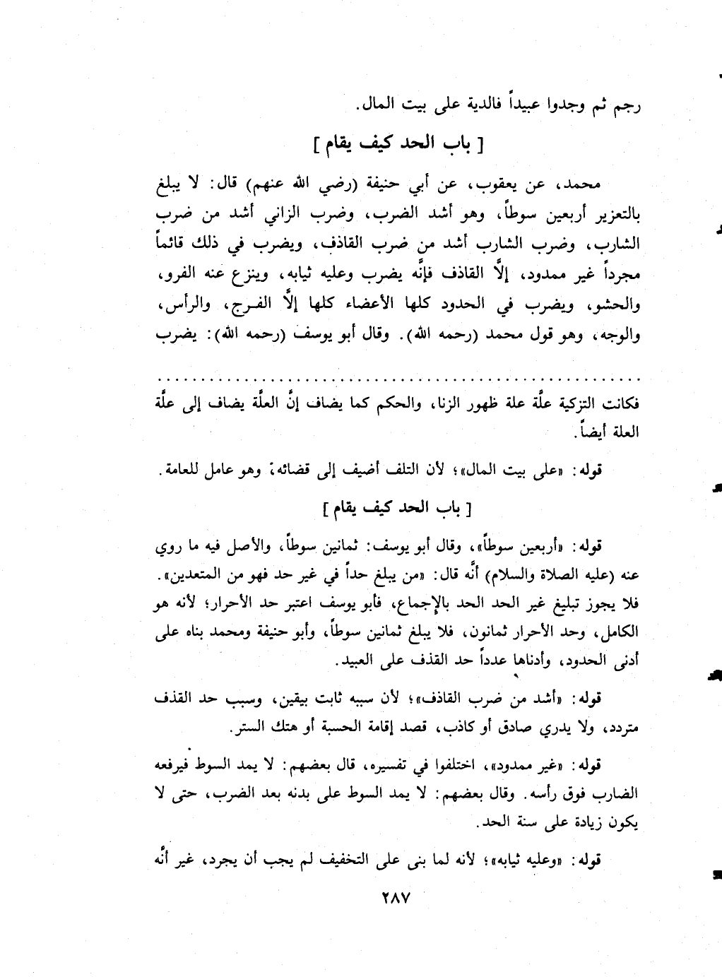 مُحَمَّد عَن يَعْقُوب عَن أبي حنيفَة (رَضِي الله عَنْهُم) قَالَ لَا يبلغ بالتعزير أَرْبَعِينَ سَوْطًا وَهُوَ أَشد الضَّرْب وَضرب الزَّانِي أَشد من ضرب الشَّارِب وَضرب الشَّارِب أَشد من ضرب الْقَاذِف وَيضْرب فِي ذَلِك قَائِما مُجَردا غير مَمْدُود الْقَاذِف فَإِنَّهُ يضْرب وَعَلِيهِ ثِيَابه وَينْزع عَنهُ الفرو والحشو وَيضْرب فِي الْحُدُود كلهَا الْأَعْضَاء كلهَا إِلَّا الْفرج وَالرَّأْس وَالْوَجْه وَهُوَ قَول مُحَمَّد (رَحمَه الله) وَقَالَ أَبُو يُوسُف (رَحمَه الله) يضْرب