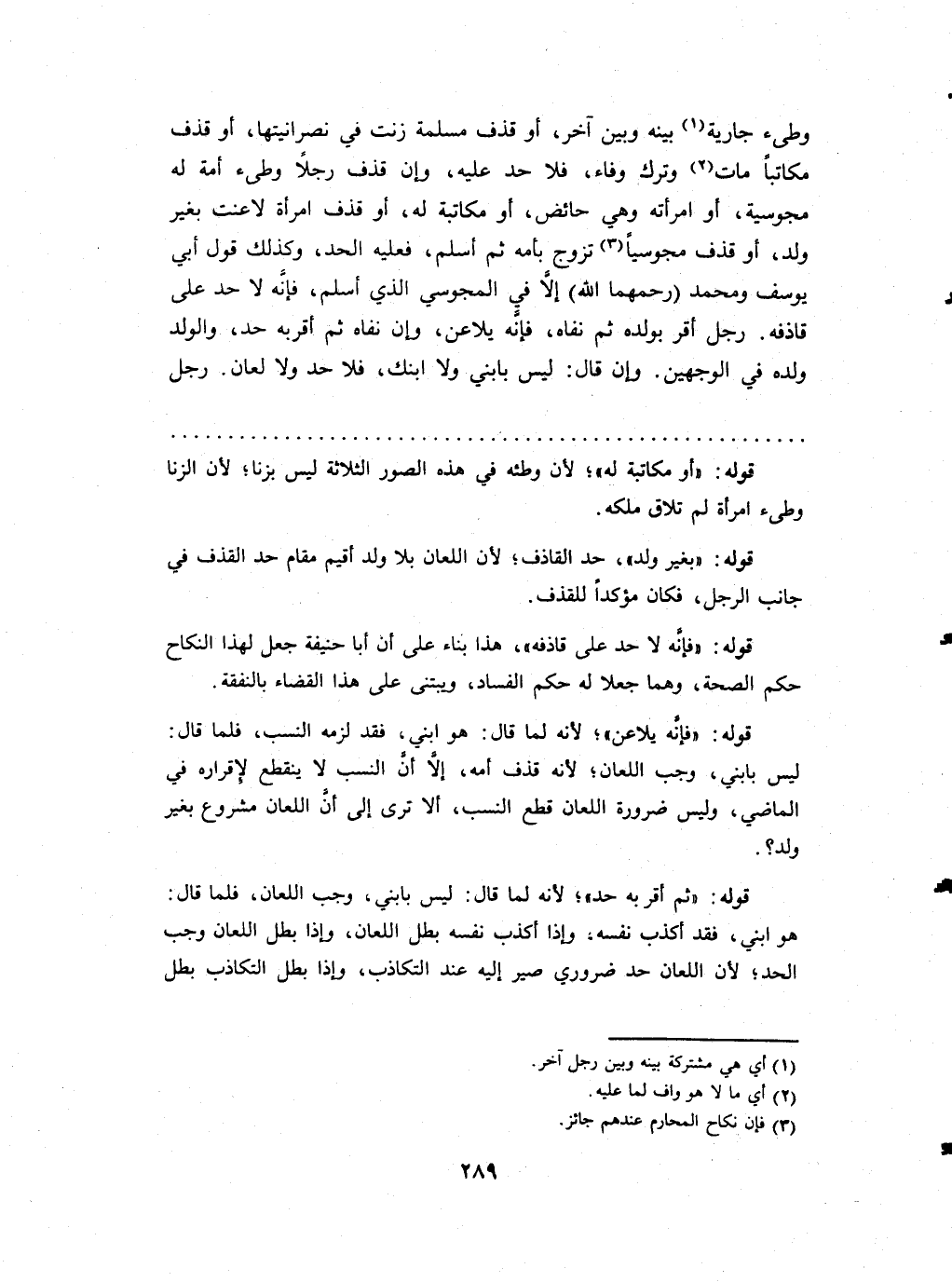 وطئ جَارِيَة بَينه وَبَين آخر أَو قذف مسلمة زنت فِي نصرانيتها أَو قذف مكَاتبا مَاتَ وَترك وَفَاء فَلَا حد عَلَيْهِ وَإِن قذف رجلا وطئ أمة لَهُ مَجُوسِيَّة أَو امْرَأَته وَهِي حَائِض أَو مُكَاتبَة لَهُ أَو قذف امْرَأَة لاعنت بِغَيْر ولد أَو قذف مجوسياً تزوج بِأُمِّهِ ثمَّ أسلم فَعَلَيهِ الْحَد وَكَذَلِكَ قَول أبي يُوسُف وَمُحَمّد (رحمهمَا الله) إِلَّا فِي الْمَجُوسِيّ الَّذِي اسْلَمْ فانه يُلَاعن وان نَفَاهُ ثمَّ اقربه حد وَالْولد وَلَده فِي الْوَجْهَيْنِ وَإِن قَالَ لَيْسَ بِابْني وَلَا ابْنك فَلَا حد وَلَا لعان رجل