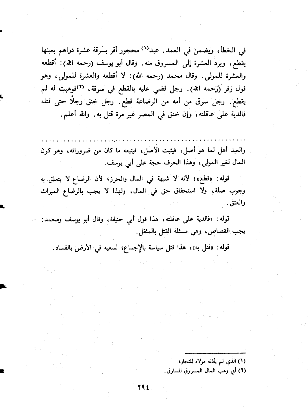 فِي الْخَطَأ وَيضمن فِي الْعمد عبد مَحْجُور أقرّ بِسَرِقَة عشرَة دَرَاهِم بِعَينهَا يقطع وَيرد الْعشْرَة إِلَى الْمَسْرُوق مِنْهُ وَقَالَ أَبُو يُوسُف (رَحمَه الله) أقطعه وَالْعشرَة للْمولى وَقَالَ مُحَمَّد (رَحمَه الله) لَا أقطعه وَالْعشرَة للْمولى هُوَ قَول زفر (رَحمَه الله) رجل قضي عَلَيْهِ بِالْقطعِ فِي سَرقَة فَوهبت لَهُ لم يقطع رجل سرق من أمه من الرضَاعَة قطع رجل خنق رجلا حَتَّى قَتله فَالدِّيَة على عاقتله وَإِن خنق فِي الْمصر غير مرّة قتل بِهِ وَالله أعلم