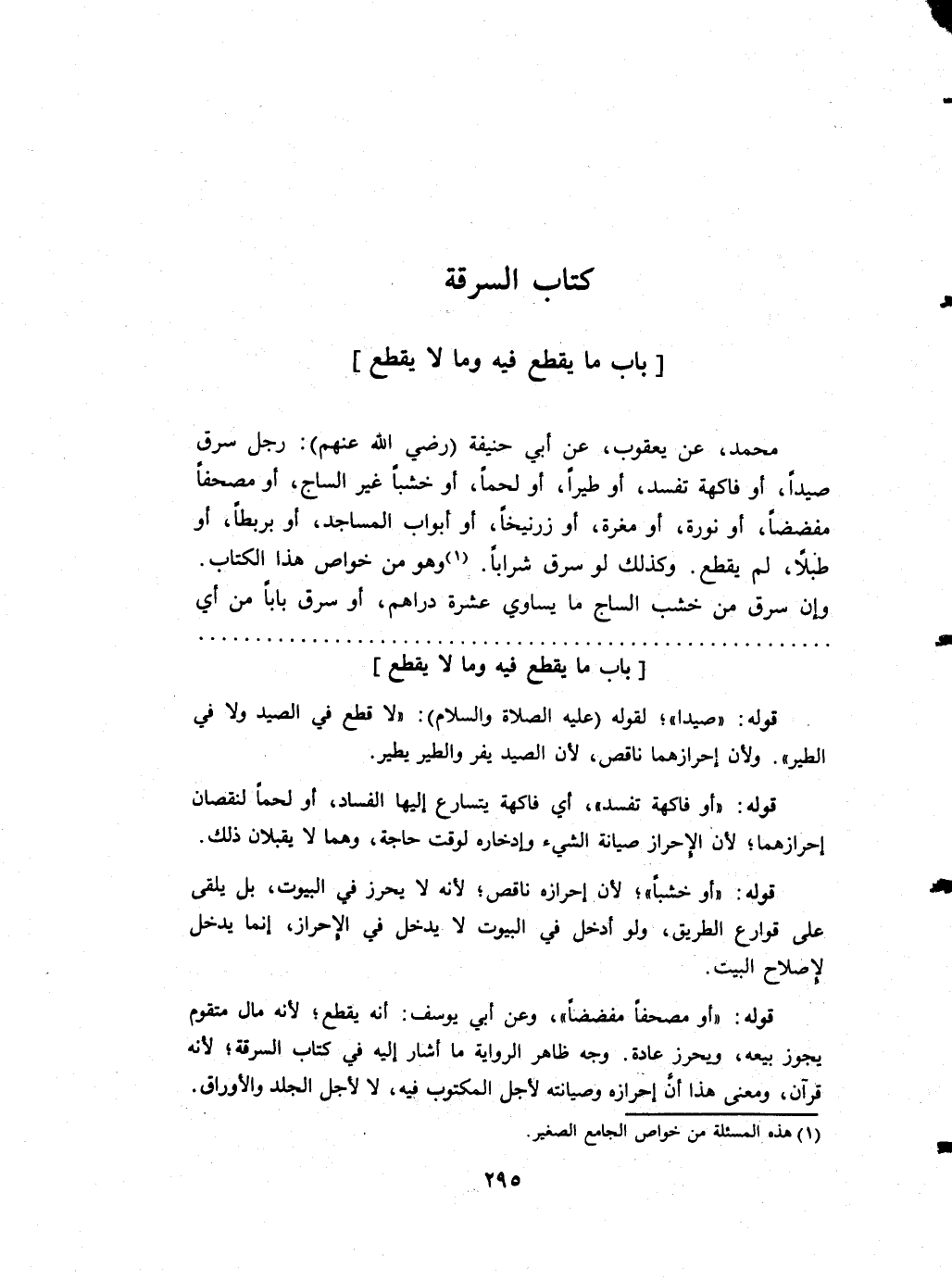 مُحَمَّد عَن يَعْقُوب عَن أبي حنيفَة (رَضِي الله عَنْهُم) رجل سرق صيدا أَو فَاكِهَة تفْسد أَو طيراً أَو لَحْمًا أَو خشباً غير الساج أَو مُصحفا مفضضاً أَو نورة أَو مغرة أَو زرنيخاً أَو أَبْوَاب الْمَسَاجِد أَو بريطا أَو طبلاً لم يقطع وَكَذَلِكَ لَو سرق شرابًا وَهُوَ من خَواص هَذَا الْكتاب