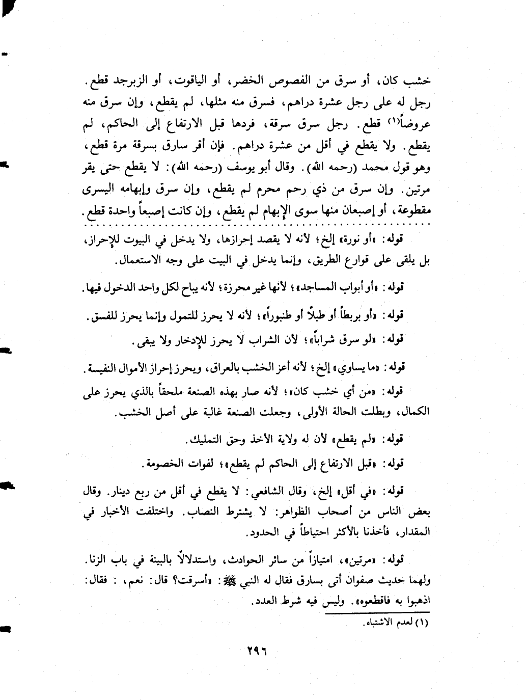 خشب كَانَ أَو سرق من الفصوص الْخضر أَو الْيَاقُوت أَو الزبرجد قطع رجل لَهُ على رجل عشرَة دَرَاهِم فَسرق مِنْهُ مثلهَا لم يقطع وَإِن سرق مِنْهُ عرُوضا قطع رجل سرق سَرقَة فَردهَا قبل الِارْتفَاع إِلَى الْحَاكِم لم يقطع وَلَا يقطع فِي أقل من عشرَة دَرَاهِم فَإِن أقرّ سَارِق بِسَرِقَة مرّة قطع وَهُوَ قَول مُحَمَّد (رَحمَه الله) وَقَالَ أَبُو يُوسُف (رَحمَه الله) لَا يقطع حَتَّى يقر مرَّتَيْنِ وَإِن سرق من ذِي رحم لم يقطع وَإِن سرق وإبهامه الْيُسْرَى مَقْطُوعَة أَو إصبعان مِنْهَا سوى الْإِبْهَام لم يقطع وَإِن كَانَت إصبعا وَاحِدَة قطع