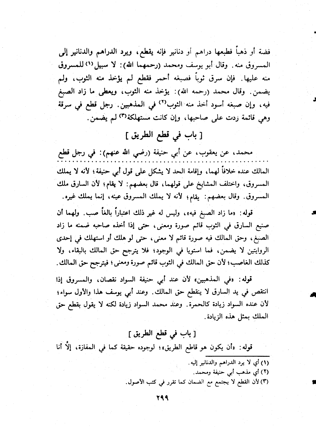 فضَّة أَو ذَهَبا فطبها دَرَاهِم أَو دَنَانِير فَإِنَّهُ يقطع وَيرد الدَّرَاهِم وَالدَّنَانِير إِلَى الْمَسْرُوق مِنْهُ وَقَالَ أيو يُوسُف وَمُحَمّد (رَحمهَا الله) لَا سَبِيل للمسروق مِنْهُ عَلَيْهَا فَإِن سرق ثوبا فصبغه أَحْمَر فَقطع لم يُؤْخَذ مِنْهُ الثَّوْب وَيُعْطى مَا زَاد الصَّبْغ فِيهِ وَإِن صبغه أسود أَخذ مِنْهُ الثَّوْب فِي المذهبين رجل قطع فِي سَرقَة وَهِي قَائِمَة ردَّتْ على صَاحبهَا وَإِن كَانَت مستهلكة لم يضمن