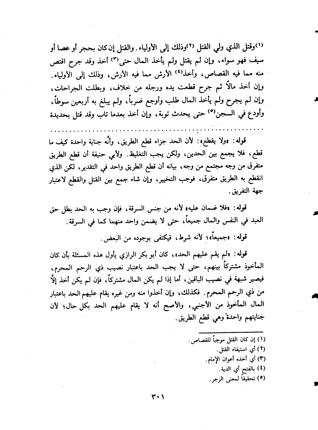 قَوْله لم يقم عَلَيْهِم الْحَد كَانَ أَبُو بكر الرَّازِيّ يأول هَذِه المسئلة بِأَن كَانَ الْمَأْخُوذ مُشْتَركا بَينهم حَتَّى لَا يجب الْحَد بِاعْتِبَار نصيب ذِي الرَّحِم الْمحرم فَيصير شُبْهَة فِي نصيب البَاقِينَ أما إِذا لم يكن المَال مُشْتَركا فَإِن لم يكن أَخذ إِلَّا من ذِي الرَّحِم الْمحرم فَكَذَلِك وَإِن أخذُوا مِنْهُ وَمن غَيره يُقَام عَلَيْهِم الْحَد بِاعْتِبَار المَال الْمَأْخُوذ من الْأَجْنَبِيّ وَالأَصَح أَنه لَا يُقَام عَلَيْهِم الْحَد بِكُل حَال لِأَن جنايتهم وَاحِدَة وَهِي قطع الطَّرِيق