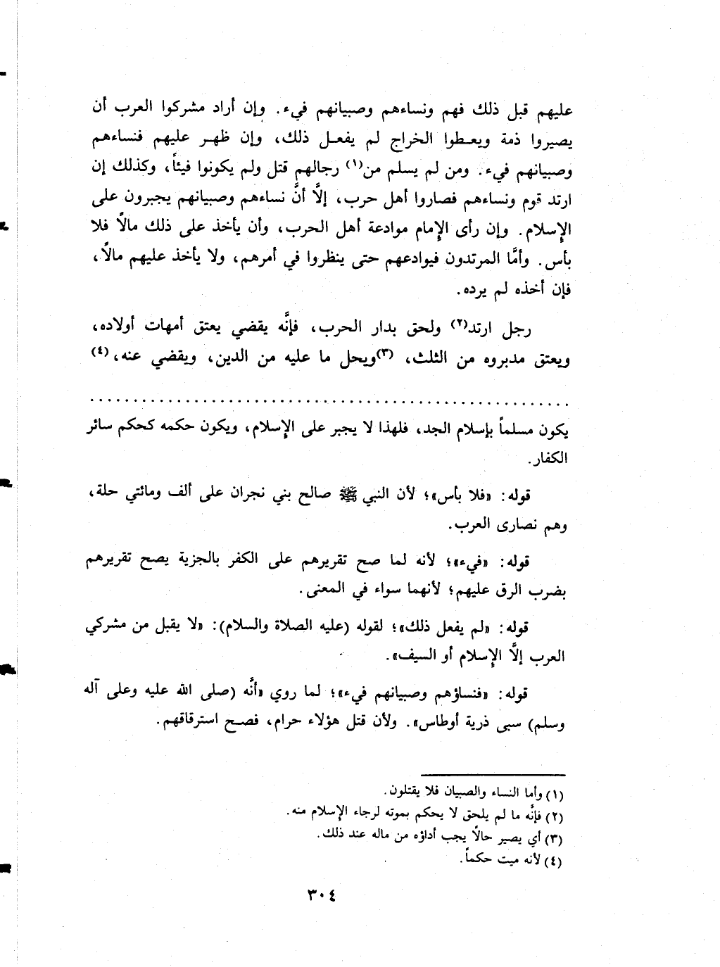 عَلَيْهِم قبل ذَلِك فهم ونساءهم وصبيانهم فَيْء وَإِن أَرَادَ مُشْرِكُوا الْعَرَب أَن يصيروا ذمَّة ويعطوا الْخراج لم يفعل ذَلِك وَإِن ظهر عَلَيْهِم فنساءهم وصبيانهم فَيْء وَمن لم يسلم من رِجَالهمْ قتل وَلم يَكُونُوا فَيْئا وَكَذَلِكَ إِن ارْتَدَّ قوم ونساءهم فصاروا أهل حَرْب إِلَّا أَن نِسَاءَهُمْ وصبيانهم يجبرون على الْإِسْلَام وَإِن رأى الإِمَام موادعة أهل الْحَرْب وَأَن يَأْخُذ على ذَلِك مَالا فَلَا بَأْس وَأما المرتدون فيوادعهم حَتَّى ينْظرُوا فِي أَمرهم وَلَا يَأْخُذ عَلَيْهِم مَالا فَإِن أَخذه لم يردهُ