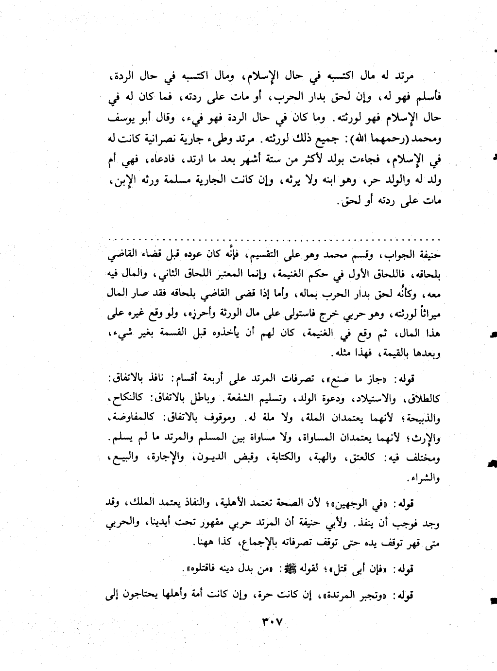 مُرْتَد لَهُ مَال اكْتَسبهُ فِي حَال الْإِسْلَام وَمَال اكْتَسبهُ فِي حَال الرِّدَّة فَأسلم فَهُوَ لَهُ وَإِن لحق بدار الْحَرْب أَو مَاتَ على ردته فَمَا كَانَ لَهُ حَال الْإِسْلَام فَهُوَ لوَرثَته وَمَا كَانَ فِي حَال الرِّدَّة فَهُوَ فَيْء وَقَالَ أَبُو يُوسُف وَمُحَمّد (رحمهمَا الله) جَمِيع ذَلِك لوَرثَته مُرْتَد وطئ جَارِيَة نَصْرَانِيَّة كَانَت لَهُ فِي الْإِسْلَام فَجَاءَت بِولد لأكْثر من سِتَّة أشهر بَعْدَمَا ارْتَدَّ فَادَّعَاهُ فَهِيَ أم ولد لَهُ وَالْولد حر وَهُوَ ابْنه وَلَا يَرِثهُ وَإِن كَانَت الْجَارِيَة مسلمة ورثت الإبن مَاتَ على ردته أَو لحق