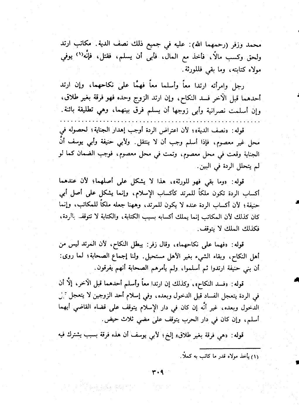 مُحَمَّد وَزفر (رَحمهَا الله) عَلَيْهِ فِي جَمِيع ذَلِك نصف الدِّيَة مكَاتب ارْتَدَّ وَلحق وَكسب مَالا فَأخذ مَعَ المَال فَأبى أَن يسلم فَقتل فَإِنَّهُ يُوفي مَوْلَاهُ كِتَابَته وَمَا بَقِي فللورثة