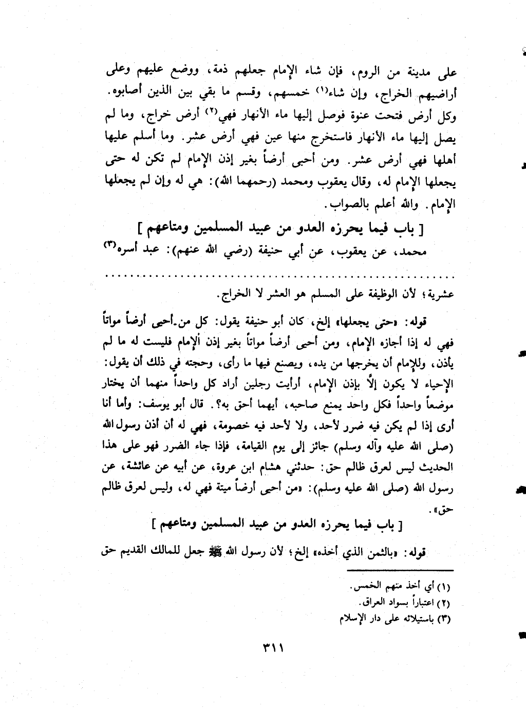 على مَدِينَة من الرّوم فَإِن شَاءَ الإِمَام جعلهم ذمَّة وَوضع عَلَيْهِم وعَلى أراضيهم الْخراج وَإِن شَاءَ خمسهم وَقسم مَا بَقِي بَين الَّذين أَصَابُوهُ وكل أَرض فتحت عنْوَة فوصل إِلَيْهَا مَاء الْأَنْهَار فَهِيَ أَرض خراج وَمَا لم يصل إِلَيْهَا مَاء الْأَنْهَار فاستخرج مِنْهَا عين فَهِيَ أَرض عشر وَمَا أسلم عَلَيْهَا أَهلهَا فَهِيَ أَرض عشر وَمن أحبى أَرضًا بِغَيْر إِذا الإِمَام لم تكن لَهُ حَتَّى يَجْعَلهَا الإِمَام لَهُ وَقَالَ يَعْقُوب وَمُحَمّد (رحمهمَا الله) هِيَ لَهُ وَإِن لم يَجْعَلهَا الإِمَام وَالله أعلم بِالصَّوَابِ