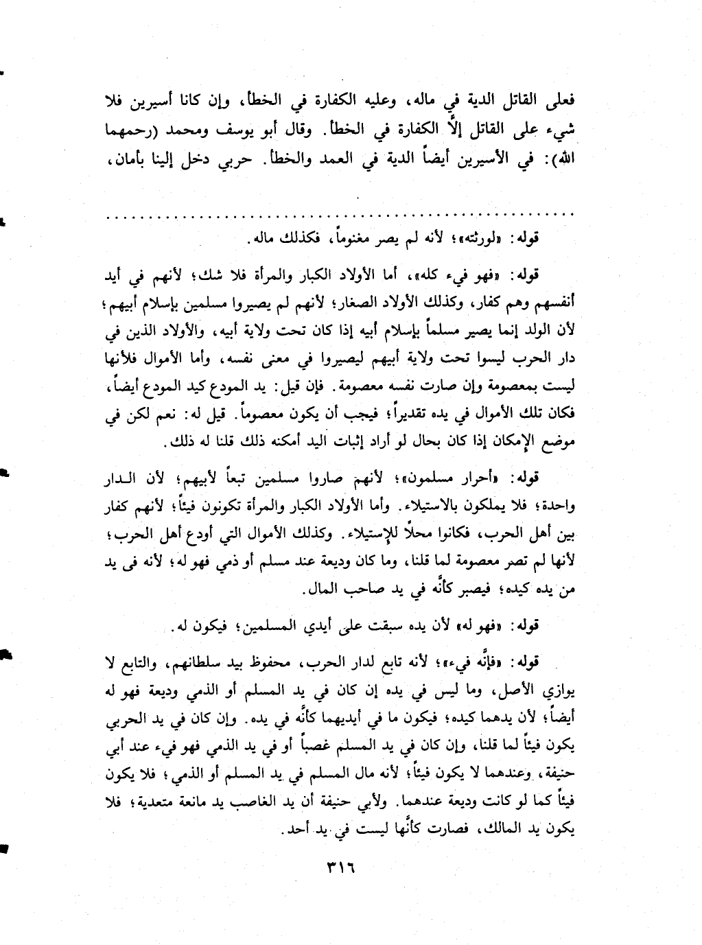 قَوْلنَا أَحْرَار مُسلمُونَ لأَنهم صَارُوا مُسلمين تبعا لأبيهم لِأَن الدَّار وَاحِدَة فَلَا يملكُونَ بِالِاسْتِيلَاءِ وَأما الْأَوْلَاد الْكِبَار والمراة تَكُونُونَ فَيْئا لانهم بَين أهل الْحَرْب فَكَانُوا محلا للإستيلاء وَكَذَلِكَ الْأَمْوَال الَّتِي أودع أهل الْحَرْب لِأَنَّهَا لم تصر معصومة لما قُلْنَا وَمَا كَانَ وَدِيعَة عِنْد مُسلم أَو ذمِّي فَهُوَ لَهُ لِأَنَّهُ فى يَد من يَده كَيده فيصبر كَأَنَّهُ فِي يَد صَاحب المَال