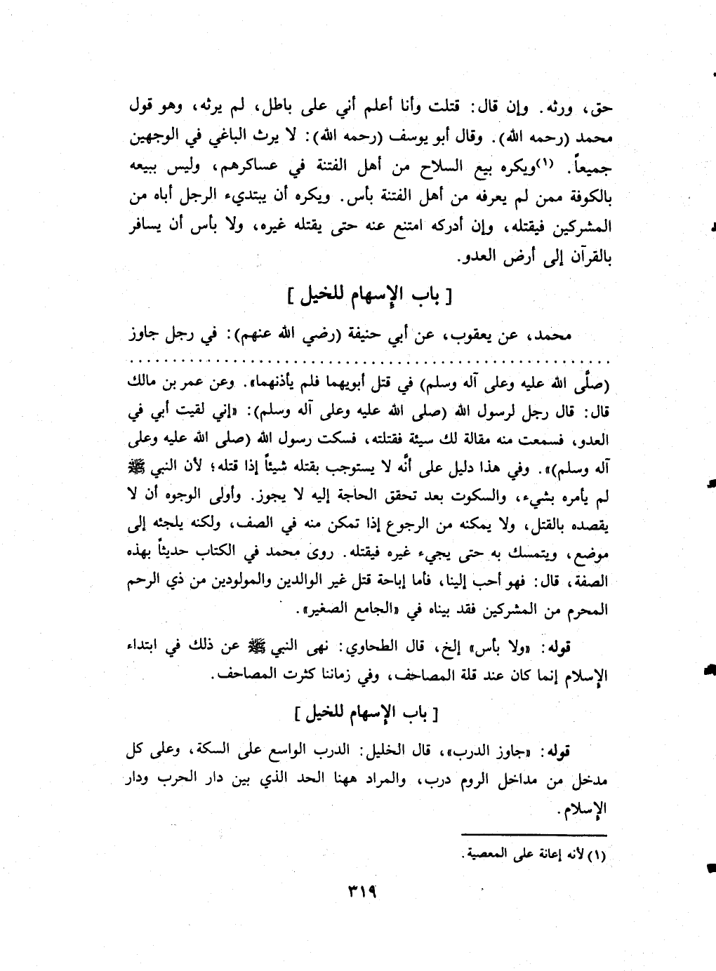 حق وَرثهُ وَإِن قَالَ قتلت وَأَنا أعلم اني على بَاطِل وَلم يَرِثهُ وَهُوَ قَول مُحَمَّد (رَحمَه الله) وَقَالَ أَبُو يُوسُف (رَحمَه الله) لَا يَرث الْبَاغِي فِي الْوَجْهَيْنِ جَمِيعًا وَيكرهُ بيع السِّلَاح وَيكرهُ بيع السِّلَاح من أهل الْفِتْنَة فِي عساكرهم وَلَيْسَ بِبيعِهِ بِالْكُوفَةِ مِمَّن لم يعرفهُ من اهل الْفِتْنَة بَأْس وَيكرهُ ان يَبْتَدِئ الرجل أَبَاهُ من الْمُشْركين فيقتله وَإِن أدْركهُ امْتنع عَنهُ حَتَّى يقْتله غَيره وَلَا بَأْس أَن يُسَافر بِالْقُرْآنِ إِلَى أَرض الْعَدو