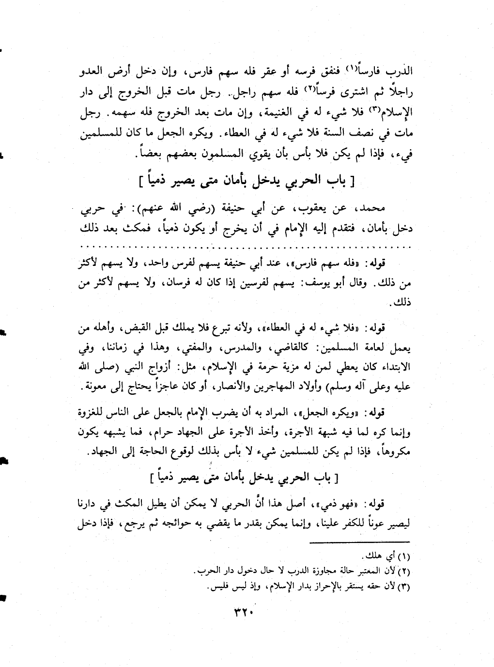 الدَّرْب فَارِسًا فنفق فرسه أَو عقر فَلهُ سهم فَارس وَإِن دخل أَرض الْعَدو رَاجِلا ثمَّ اشْترى فرسا فَلهُ سهم راجل رجل مَاتَ قبل الْخُرُوج إِلَى دَار السَّلَام فَلَا شَيْء لَهُ فِي الْغَنِيمَة وَإِن مَاتَ بعد الْخُرُوج فَلهُ سَهْمه رجل مَاتَ فِي نصف السّنة فَلَا شَيْء لَهُ فِي الْعَطاء وَيكرهُ الْجعل مَا كَانَ للْمُسلمين فَيْء فَإِذا لم يكن فَلَا بَأْس بِأَن يُقَوي الْمُسلمُونَ بَعضهم بَعْضًا