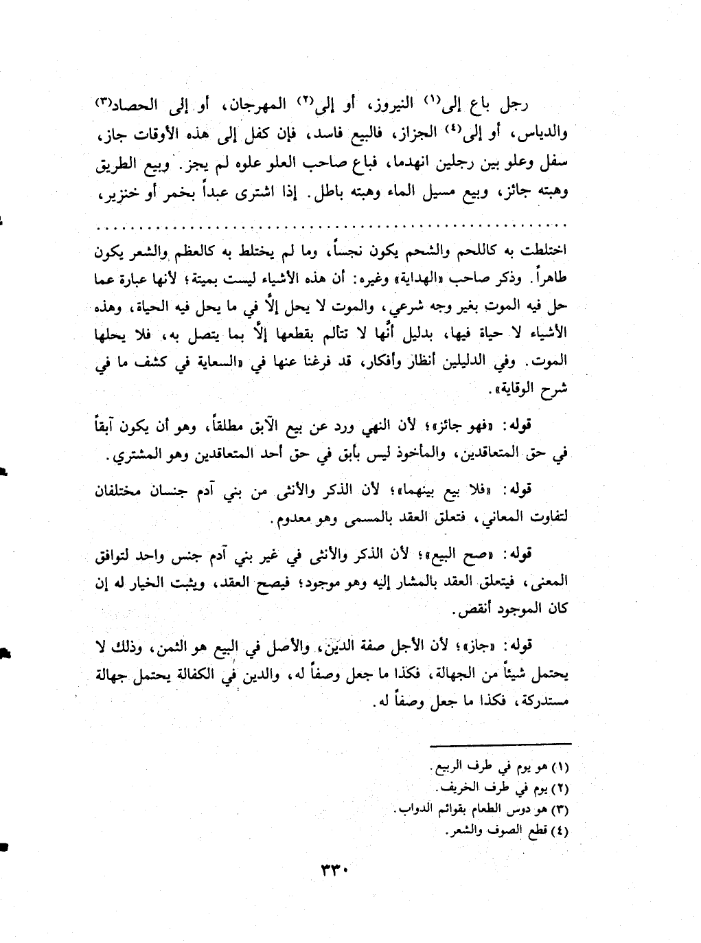رجل بَاعَ إِلَى النيروز أَو إِلَى المهرجان أَو إِلَى الْحَصاد والدياس أَو إِلَى الجزاز فَالْبيع فَاسد فَإِن كفل إِلَى هَذِه الْأَوْقَات جَازَ سفل وعلو بَين رجلَيْنِ انهدما فَبَاعَ صَاحب الْعُلُوّ علوه لم يجز وَبيع الطَّرِيق وهبته جَائِز وَبيع مسيل المَاء وهبته بَاطِل اذا اشْترى عبدا بِخَمْر اَوْ خِنْزِير