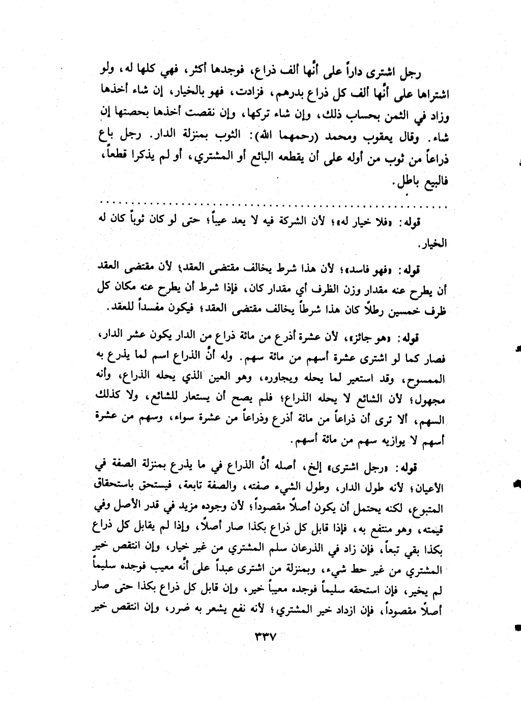 رجل اشْترى دَارا على أَنَّهَا ألف ذِرَاع فَوَجَدَهَا أَكثر فَهِيَ كلهَا لَهُ وَلَو اشْتَرَاهَا على أَنَّهَا ألف كل ذِرَاع بدرهم فزادت فَهُوَ بِالْخِيَارِ إِن شَاءَ أَخذهَا وَزَاد فِي الثّمن بِحِسَاب ذَلِك وَإِن شَاءَ تَركهَا وَإِن نقصت أَخذهَا بحصتها إِن شَاءَ وَقَالَ يَعْقُوب وَمُحَمّد (رحمهمَا الله) الثَّوْب بِمَنْزِلَة الدَّار رجل بَاعَ ذِرَاعا من ثوب من أَوله على أَن يقطعهُ البَائِع أَو المُشْتَرِي أَو لم يذكرَا قطعا فَالْبيع بَاطِل