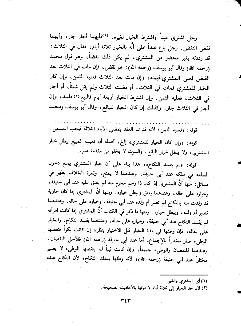 رجل اشْترى عبدا وَاشْترط الْخِيَار لغيره فَأَيّهمَا أجَاز جَازَ وَأيهمَا نقض انْتقض رجل بَاعَ عبدا على أَنه بِالْخِيَارِ ثَلَاثَة أَيَّام فَقَالَ فِي الثَّلَاث قد رَددته بِغَيْر محْضر من المُشْتَرِي لم يكن ذَلِك نقضا وَهُوَ قَول مُحَمَّد (رَحمَه الله) وَقَالَ أَبُو يُوسُف (رَحمَه الله) هُوَ نقض فَإِن مَاتَ فِي الثَّلَاث بعد الْقَبْض فعلى المُشْتَرِي قِيمَته وَإِن مَاتَ بعد الثَّلَاث فَعَلَيهِ الثّمن وَإِن كَانَ الْخِيَار للْمُشْتَرِي فَمَاتَ فِي الثَّلَاث أَو مَضَت الثَّلَاث وَلم يقل شَيْئا أَو أجَاز فِي الثَّلَاث فعيله الثّمن وَإِن اشْترط الْخِيَار أَرْبَعَة أَيَّام فَالْبيع فَاسد وَإِن أجَاز فِي الثَّلَاث جَازَ وَكَذَلِكَ إِن كَانَ الْخِيَار للْبَائِع وَقَالَ أَبُو يُوسُف وَمُحَمّد