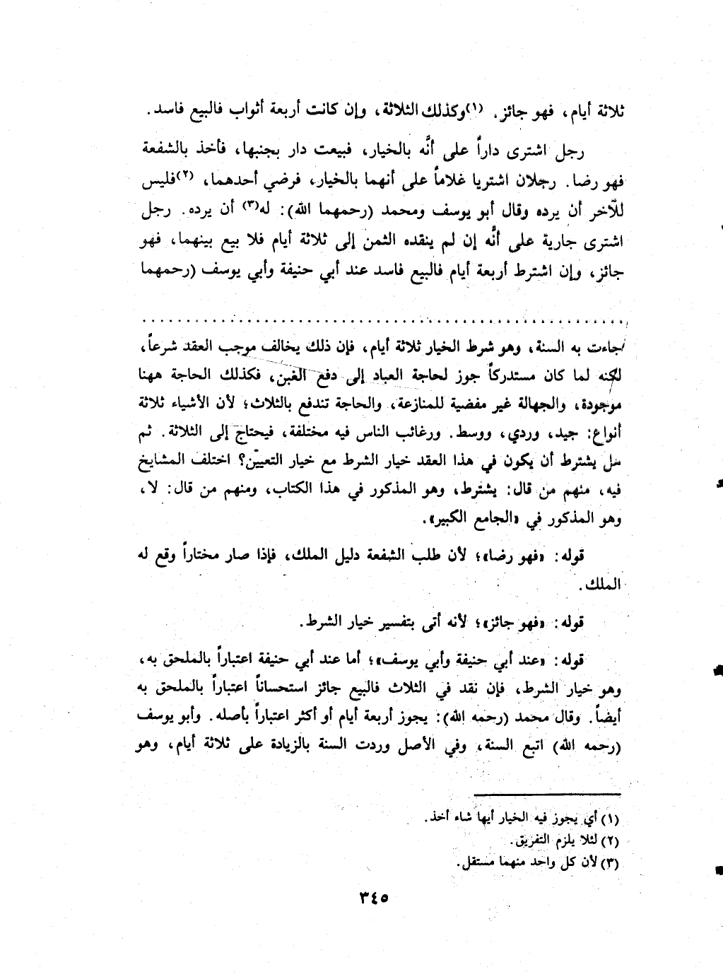 رجل اشْترى دَارا على انه بالخيرا فبيعت دَار بجنبها فَأخذ بِالشُّفْعَة فَهُوَ رضَا رجلَانِ اشتريا غُلَاما على أَنَّهُمَا بِالْخِيَارِ فَرضِي أَحدهمَا فَلَيْسَ للْآخر أَن يردهُ وَقَالَ أَبُو يُوسُف وَمُحَمّد (رحمهمَا الله) لَهُ أَن يردهُ رجل اشْترى جَارِيَة على أَنه إِن لم ينقده الثّمن إِلَى ثَلَاثَة أَيَّام فَلَا بيع بَينهمَا فَهُوَ جَائِز وَإِن اشْترط أَرْبَعَة أَيَّام فَالْبيع فَاسد عَن أبي حنيفَة وَأبي يُوسُف (رحمهمَا