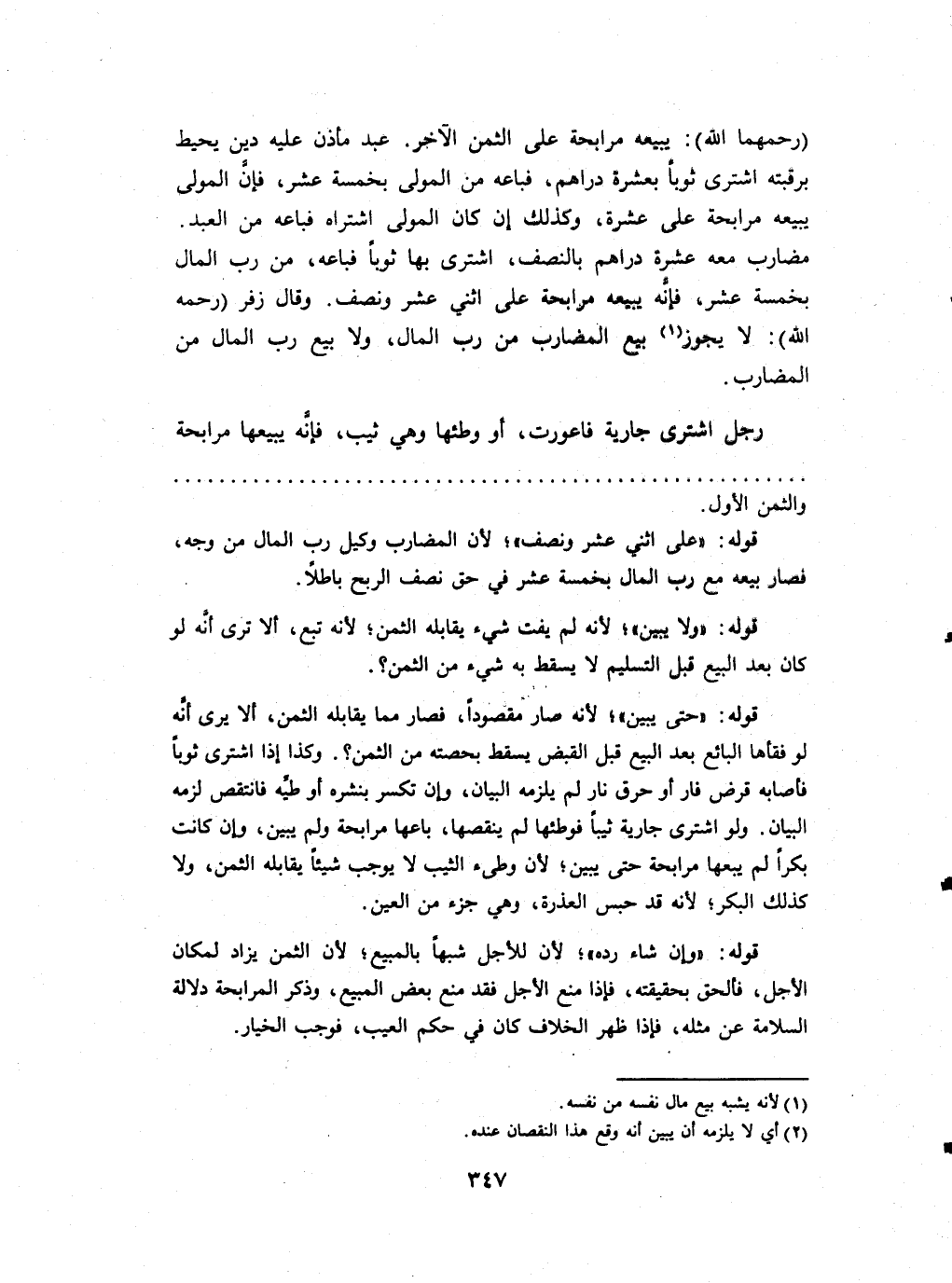 (رحمهمَا الله) يَبِيعهُ مُرَابحَة على الثّمن الآخر عبد مأذن عَلَيْهِ دين يُحِيط برقته اشْترى ثوبا بِعشْرَة دَرَاهِم فَبَاعَهُ من الْمولى بِخَمْسَة عشرَة فَإِن الْمولى يَبِيعهُ مُرَابحَة على عشرَة وَكَذَلِكَ إِن كَانَ الْمولى اشْتَرَاهُ فَبَاعَهُ من العَبْد مضَارب مَعَه عشرَة دَرَاهِم بِالنِّصْفِ اشْترى بهَا ثوبا فَبَاعَهُ من رب المَال بِخَمْسَة عشر فَإِنَّهُ يَبِيعهُ مُرَابحَة على اثْنَي عشرَة نصف وَقَالَ زفر (رَحمَه الله) لَا يجوز بيع المضار من رب المَال وَلَا بيع رب المَال من الْمضَارب