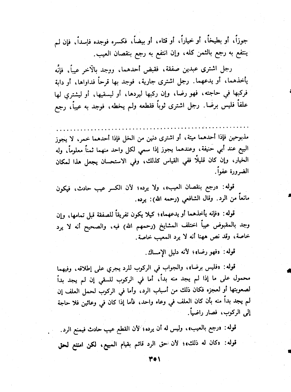 رجل اشْترى عَبْدَيْنِ صَفْقَة فَقبض أَحدهمَا وَوجد بِالْآخرِ عَيْبا فَإِنَّهُ يأخذهما أَو يدعهما رجل اشْترى جَارِيَة فَوجدَ بهَا قرحاً فداواها أَو دَابَّة فركبها فِي حَاجته فَهُوَ رضَا وَإِن ركبهَا ليردها أَو ليسقيها أَو ليشترى لَهَا علفاً فَلَيْسَ بِرِضا رجل اشْترى ثوبا فَقَطعه وَلم يخطه فَوجدَ بِهِ عَيْبا رَجَعَ