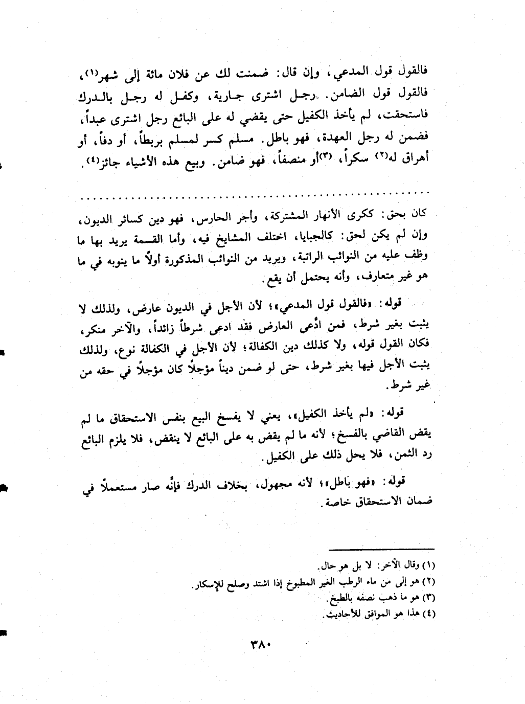 فَالْقَوْل قَول الْمُدَّعِي وَإِن قَالَ ضمنت لَك عَن فلَان مائَة إِلَى شهر فَالْقَوْل قَول الضَّامِن رجل اشْترى جَارِيَة وكفل لَهُ رجل بالدرك فاستحقت لم يَأْخُذ الْكَفِيل حَتَّى يقْضِي لَهُ على البَائِع رجل اشْترى عبدا فضمن لَهُ رجل الْعهْدَة فَهُوَ بَاطِل مُسلم كسر لمُسلم بربطاً أَو دفاً أَو أهراق لَهُ سكرا أَو منصفاً فَهُوَ ضَامِن وَبيع هَذِه الْأَشْيَاء جَائِز