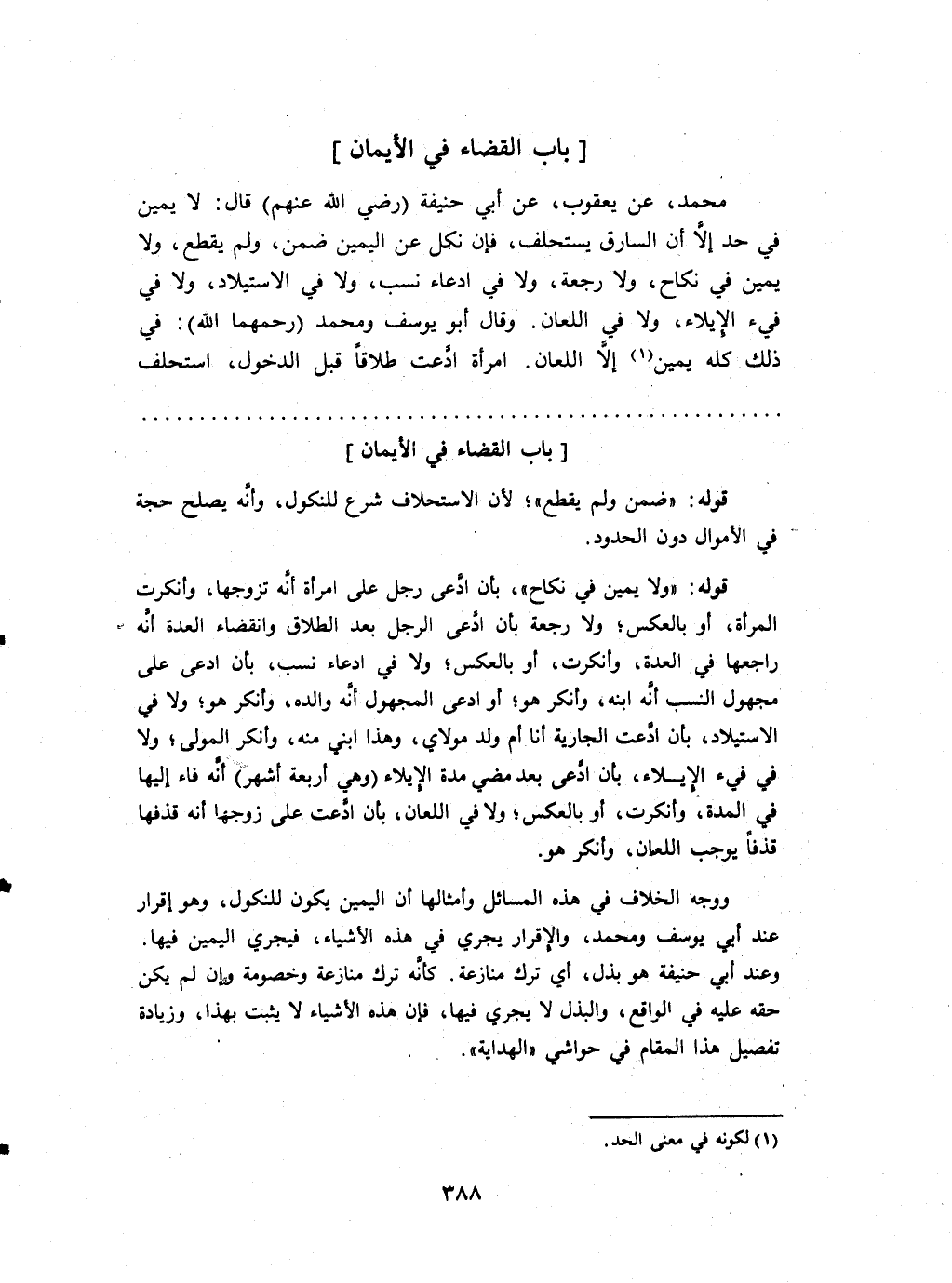 مُحَمَّد عَن يَعْقُوب عَن أبي حنيفَة (رَضِي الله عَنْهُم) قَالَ لَا يَمِين فِي حد إِلَّا أَن السَّارِق يسْتَحْلف فَإِن نكل عَن الْيَمين ضمن وَلم يقطع وَلَا يَمِين فِي نِكَاح وَلَا رَجْعَة وَلَا فِي ادِّعَاء نسب وَلَا فِي الِاسْتِيلَاد وَلَا فَيْء الْإِيلَاء وَلَا فِي اللّعان وَقَالَ أَبُو يُوسُف وَمُحَمّد (رحمهمَا الله) فِي ذَلِك كُله يَمِين إِلَّا اللّعان امْرَأَة ادَّعَت طَلَاقا قبل الدُّخُول اسْتخْلف
