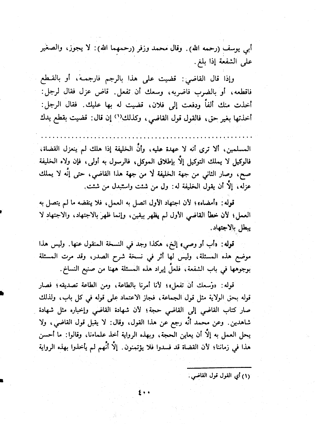 قَوْله وسعك أَن تفعل لأَنا أمرنَا بِالطَّاعَةِ وَمن الطَّاعَة تَصْدِيقه فَصَارَ قَوْله بِحَق الْولَايَة مثل قَول الْجَمَاعَة فَجَاز الِاعْتِمَاد على قَوْله فِي كل بَاب وَلذَلِك صَار كتاب القَاضِي إِلَى القَاضِي حجَّة لِأَن شَهَادَة القَاضِي وإخباره مثل شَهَادَة شَاهِدين وَعَن مُحَمَّد أَنه رَجَعَ عَن هَذَا القَوْل وَقَالَ لَا يقبل قَول القَاضِي وَلَا يحل الْعَمَل بِهِ إِلَّا أَن يعاين الْحجَّة وبهذه الرِّوَايَة أَخذ علماءنا وَقَالُوا مَا أحسن هَذَا فِي زَمَاننَا لِأَن الْقُضَاة قد فسدوا فَلَا يؤتمنون إِلَّا أَنهم لم يَأْخُذُوا بِهَذِهِ الرِّوَايَة