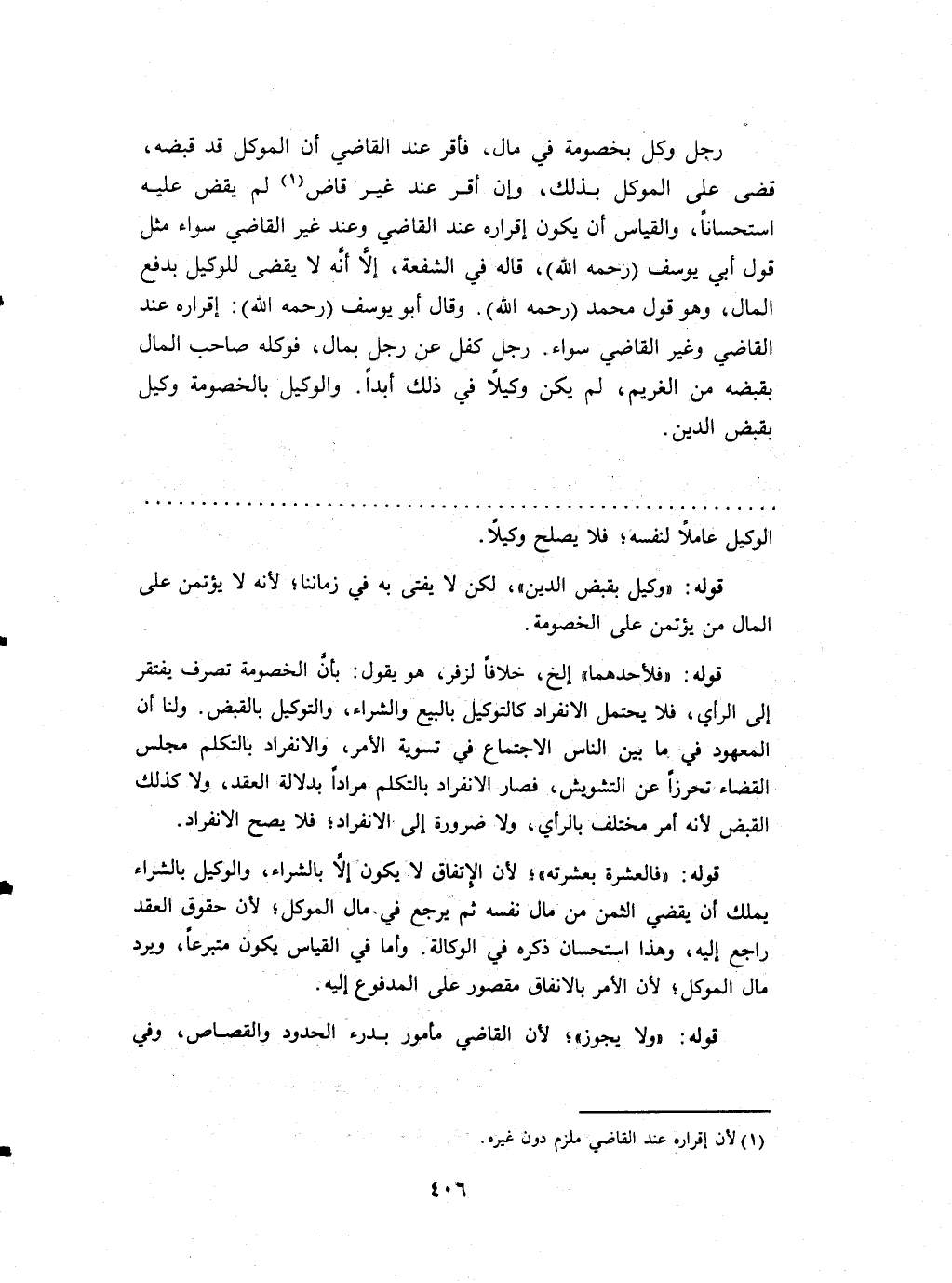 406 - رجل وكل بخصومة فِي مَال فَأقر عِنْد القَاضِي أَن الْمُوكل قد قَبضه فَقضى على الْمُوكل بذلك وَإِن أقرّ عِنْد غير قَاض لم يقْض عَلَيْهِ اسْتِحْسَانًا وَالْقِيَاس أَن يكون إِقْرَاره عِنْد القَاضِي وَعند غير القَاضِي سَوَاء مثل قَول أبي يُوسُف (رَحمَه الله) قَالَه فِي الشُّفْعَة إِلَّا أَنه لَا يقْضى للْوَكِيل بِدفع المَال وَهُوَ قَول مُحَمَّد (رَحمَه الله) وَقَالَ أَبُو يُوسُف (رَحمَه الله) إِقْرَاره عِنْد القَاضِي وَغير القَاضِي سَوَاء رجل كفل عَن رجل بِمَال فوكله صَاحب المَال بِقَبْضِهِ من الْغَرِيم لم يكن وَكيلا فِي ذَلِك أبدا وَالْوَكِيل بِالْخُصُومَةِ وَكيل بِقَبض الدّين الْوَكِيل عَاملا لنَفسِهِ فَلَا يصلح وَكيلا