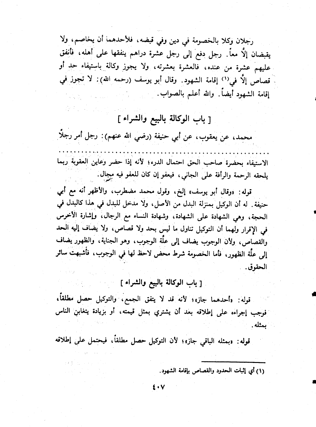 رجلَانِ وكلا بِالْخُصُومَةِ فِي دين وَفِي قَبضه فلأحدهما أَن يُخَاصم وَلَا يقبضان إِلَّا مَعَ رجل دفع إِلَى رجل عشرَة دَرَاهِم ينفقها على أَهله فأنفق عَلَيْهِم عشرَة من عِنْده فالعشرة بعشرته وَلَا يجوز وكَالَة بِاسْتِيفَاء حد أَو قصاص إِلَّا فِي إِقَامَة الشُّهُود وَقَالَ أَبُو يُوسُف (رَحمَه الله) لَا تجوز فِي إِقَامَة الشُّهُود أَيْضا وَالله أعلم بِالصَّوَابِ