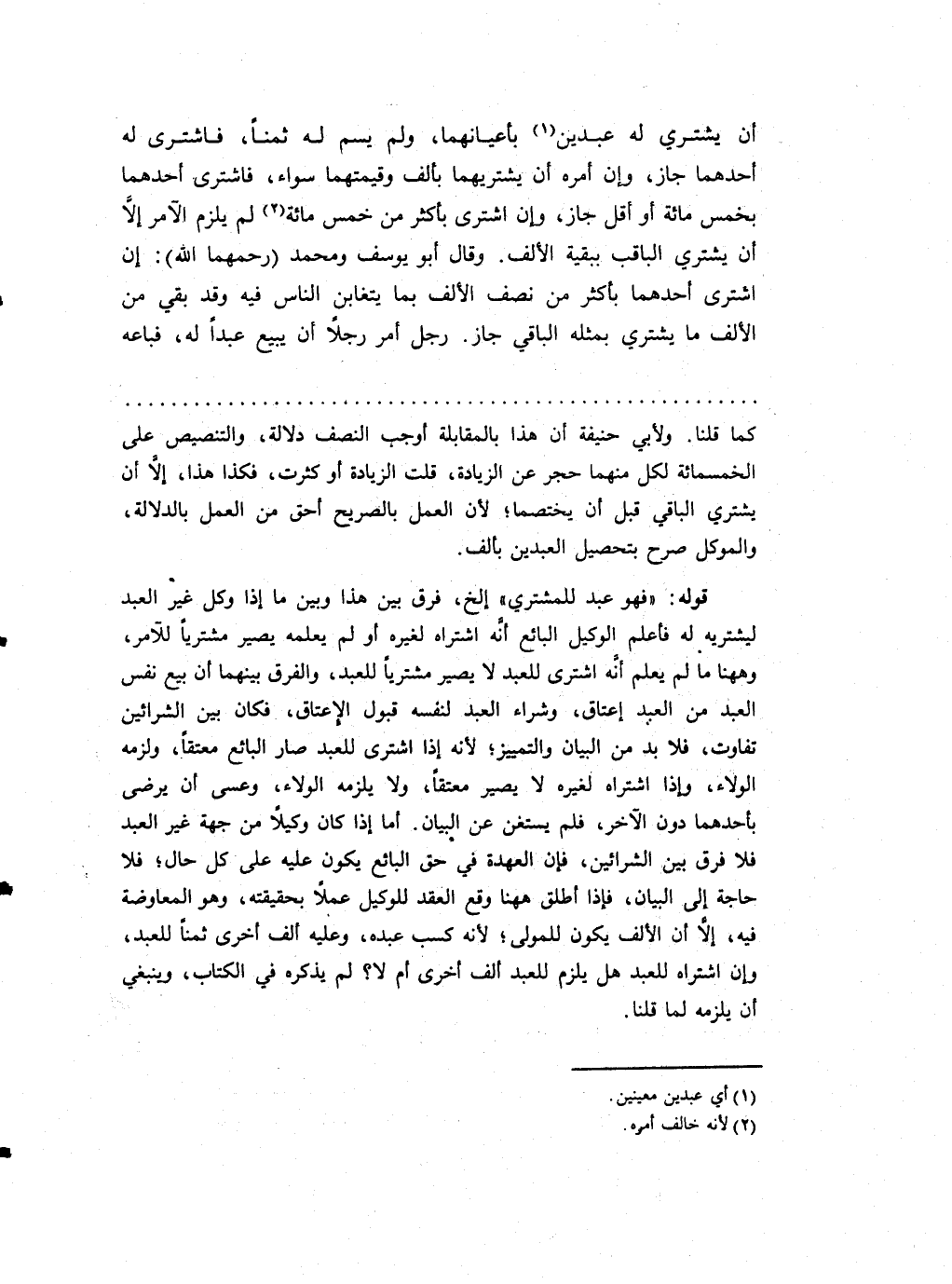 أَن يَشْتَرِي لَهُ عَبْدَيْنِ بأعيانهما وَلم يسم لَهُ ثمنا فَاشْترى لَهُ أَحدهمَا جَازَ وَإِن أمره أَن يشتريهما بِأَلف وقيمتهما سَوَاء فَاشْترى أَحدهمَا بِخمْس مائَة أَو أقل جَازَ وَإِن اشْترى بِأَكْثَرَ من خمس مائَة لم يلْزم الْآمِر إِلَّا أَن يَشْتَرِي والباقب بِبَقِيَّة الْألف وَقَالَ أَبُو يُوسُف وَمُحَمّد (رحمهمَا الله) إِن اشْترى أَحدهمَا بِأَكْثَرَ من نصف الْألف بِمَا يتَغَابَن النَّاس فِيهِ وَقد بَقِي من الْألف مَا يَشْتَرِي بِمثلِهِ الْبَاقِي جَازَ رجل أَمر رجلا أَن يَبِيع عبدا لَهُ فَبَاعَهُ