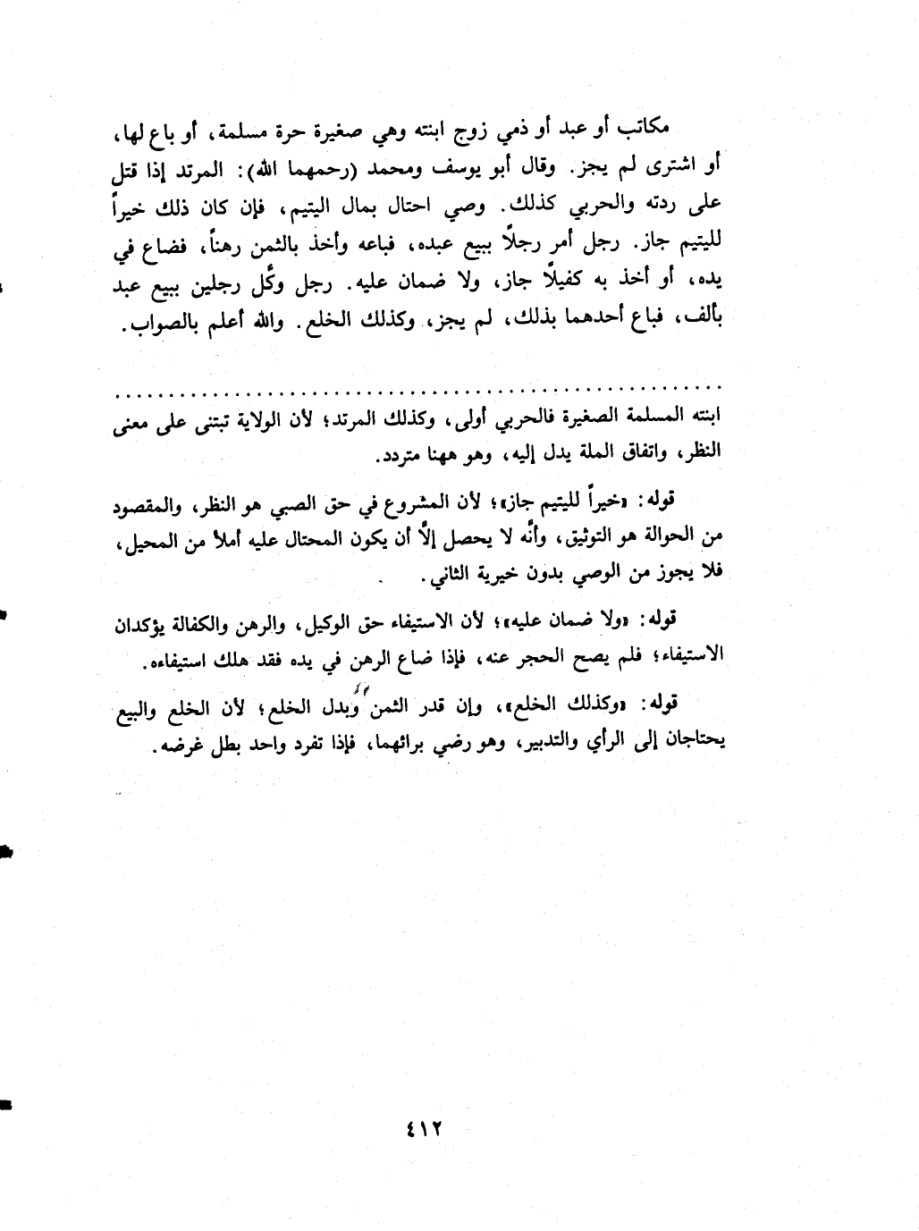 مكَاتب أَو عبد أَو ذمِّي زوج ابْنَته وَهِي صَغِيرَة حرَّة مسلمة أَو بَاعَ لَهَا أَو اشْترى لم يجز وَقَالَ أَبُو يُوسُف وَمُحَمّد (رحمهمَا الله) الْمُرْتَد إِذا قتل على ردته وَالْحَرْبِيّ كَذَلِك وَصِيّ احتال بِمَال الْيَتِيم فَإِن كَانَ ذَلِك خيرا للْيَتِيم جَازَ رجل أَمر رجلا بِبيع عَبده فَبَاعَهُ وَأخذ بِالثّمن رهنا فَضَاعَ فِي يَده أَو أَخذ بِهِ كَفِيلا جَازَ وَلَا ضَمَان عَلَيْهِ رجل وكل رجلَيْنِ بِبيع عبد بِأَلف فَبَاعَ أَحدهمَا بذلك لم يجز وَكَذَلِكَ الْخلْع وَالله أعلم بِالصَّوَابِ