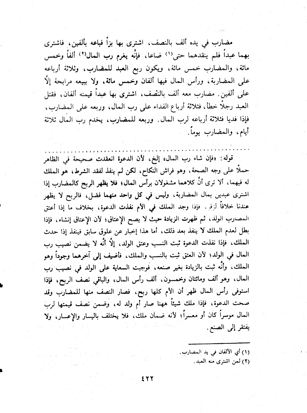 مضَارب فِي يَده ألف بِالنِّصْفِ اشْترى بهَا بزاً فَبَاعَهُ بِأَلفَيْنِ فَاشْترى بهما عبدا فَلم ينقدهما حَتَّى ضاعا فَإِنَّهُ يغرم رب المَال ألفا وَخمْس مائَة وَالْمُضَارب خمس مائَة وَيكون ربع العَبْد للْمُضَارب وَثَلَاثَة أَرْبَاعه على الْمُضَاربَة وَرَأس المَال فِيهَا أَلفَانِ وَخمْس مائَة وَلَا يَبِيعهُ مُرَابحَة إِلَّا على أَلفَيْنِ مضَارب مَعَه ألف بِالنِّصْفِ اشْترى بهَا عبدا قِيمَته أَلفَانِ فَقتل العَبْد رجلا خطأ فَثَلَاثَة أَربَاع الْفِدَاء على رب المَال وربعه على الْمضَارب فَإِذا فديا فَثَلَاثَة أَرْبَاعه لرب المَال وربعه للْمُضَارب يخْدم رب المَال ثَلَاثَة أَيَّام وَالْمُضَارب يَوْمًا