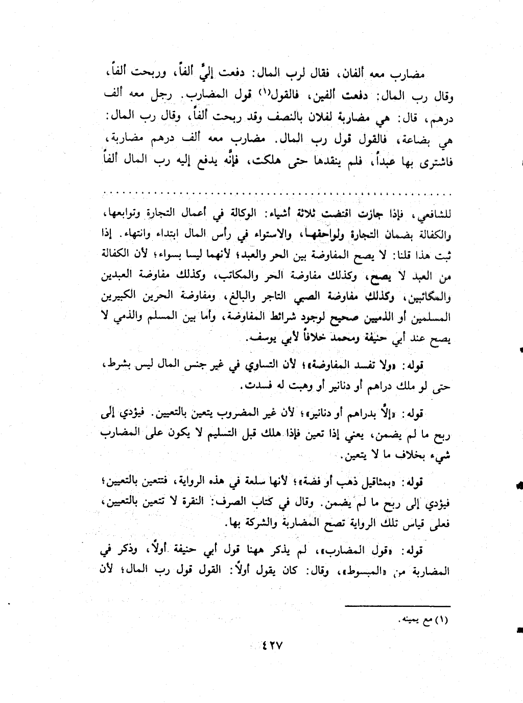 للشَّافِعِيّ فَإِذا جَازَت اقْتَضَت ثَلَاثَة أَشْيَاء الْوكَالَة فِي أَعمال التِّجَارَة وتوابعها وَالْكَفَالَة بِضَمَان التِّجَارَة ولواحقها والاستواء فِي رَأس المَال ابْتِدَاء وانتهاء إِذا ثَبت هَذَا قُلْنَا لَا يَصح الْمُفَاوضَة بَين الْحر وَالْعَبْد لِأَنَّهُمَا ليسَا بِسَوَاء لِأَن الْكفَالَة من العَبْد لَا يَصح وَكَذَلِكَ مُفَاوَضَة الْحر وَالْمكَاتب وَكَذَلِكَ مُفَاوَضَة الْعَبْدَيْنِ والمكاتبين وَكَذَلِكَ مُفَاوَضَة الصَّبِي التَّاجِر والبالغ ومفاوضة الحرين الكبيرين الْمُسلمين أَو الذميين صَحِيح لوُجُود شَرَائِط الْمُفَاوضَة وَأما بَين الْمُسلم وَالذِّمِّيّ لَا يَصح عِنْد أبي حنيفَة وَمُحَمّد خلافًا لأبي يُوسُف