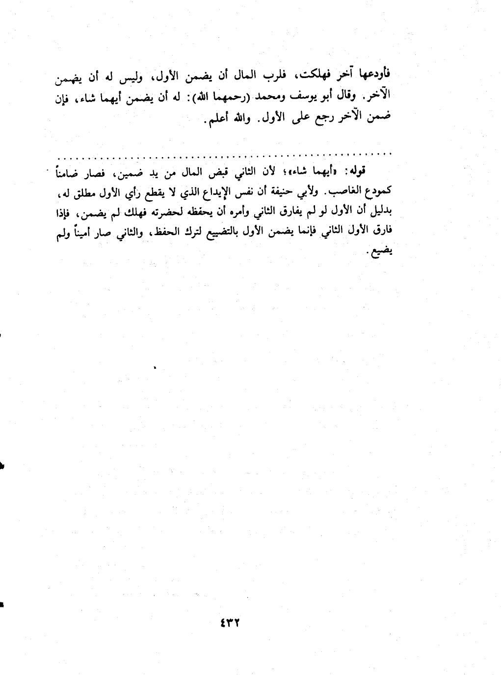 فأودعها آخر فَهَلَكت فلرب المَال أَن يضمن الأول وَلَيْسَ لَهُ أَن يضمن الآخر وَقَالَ أَبُو يُوسُف وَمُحَمّد (رحمهمَا الله) لَهُ أَن يضمن أَيهمَا شَاءَ فَإِن ضمن الآخر رَجَعَ على الأول وَالله أعلم