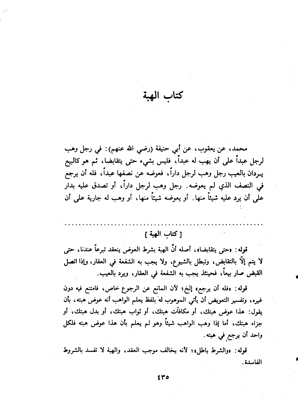 مُحَمَّد عَن يَعْقُوب عَن أبي حنيفَة رَضِي الله عَنْهُم) فِي رجل وهب لرجل عبدا على أَن يهب لَهُ عبدا فَلَيْسَ بِشَيْء حَتَّى يتقابضا ثمَّ هُوَ كَالْبيع يردان بِالْعَيْبِ رجل وهب لرجل دَارا فَعوضهُ عَن نصفهَا عبدا فَلهُ أَن يرجع فِي النّصْف الَّذِي لم يعوضه رجل وهب لرجل دَارا أَو تصدق عَلَيْهِ بدار على أَن يرد عَلَيْهِ شَيْئا مِنْهَا أَو يعوضه شَيْئا مِنْهَا أَو وهب لَهُ جَارِيَة على أَن