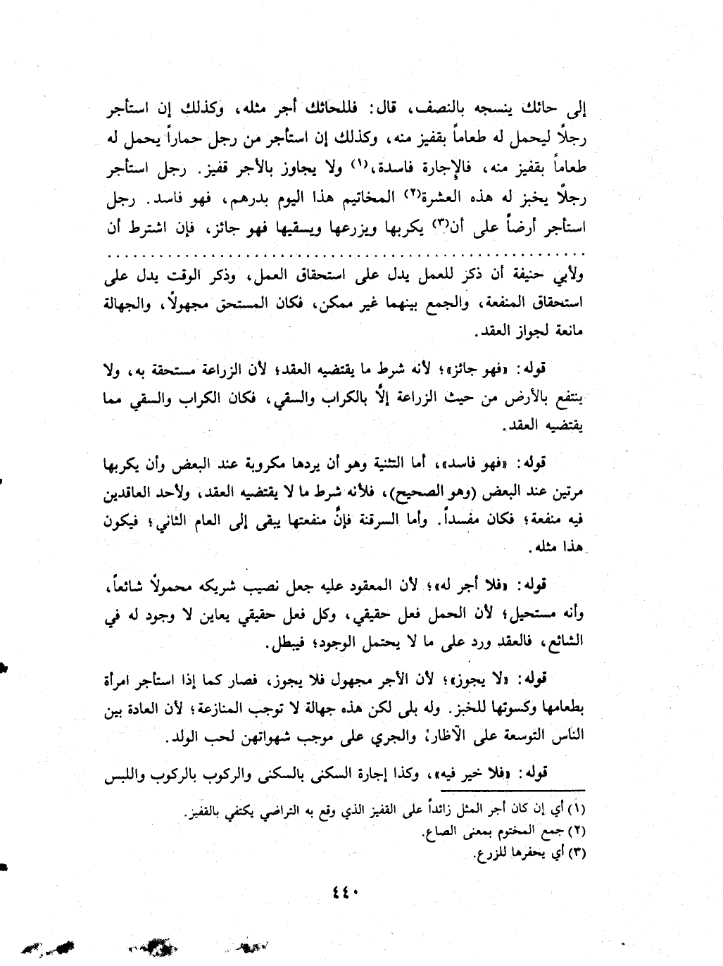 إِلَى حائك ينسجه بِالنِّصْفِ قَالَ فللحائك أجر مثله وَكَذَلِكَ إِن اسْتَأْجر رجلا ليحمل لَهُ طَعَاما بقفيز مِنْهُ وَكَذَلِكَ إِن اسْتَأْجر من رجل حمارا يحمل لَهُ طَعَاما بقفيز مِنْهُ فَالْإِجَارَة فَاسِدَة وَلَا يُجَاوز بِالْأَجْرِ قفيز رجل اسْتَأْجر رجلا يخبز لَهُ هَذِه الْعشْرَة المخاتيم هَذَا الْيَوْم بدرهم فَهُوَ فَاسد رجل اسْتَأْجر أَرضًا على أَن يكربها ويزرعها ويسقيها فَهُوَ جَائِز فَإِن اشْترط أَن