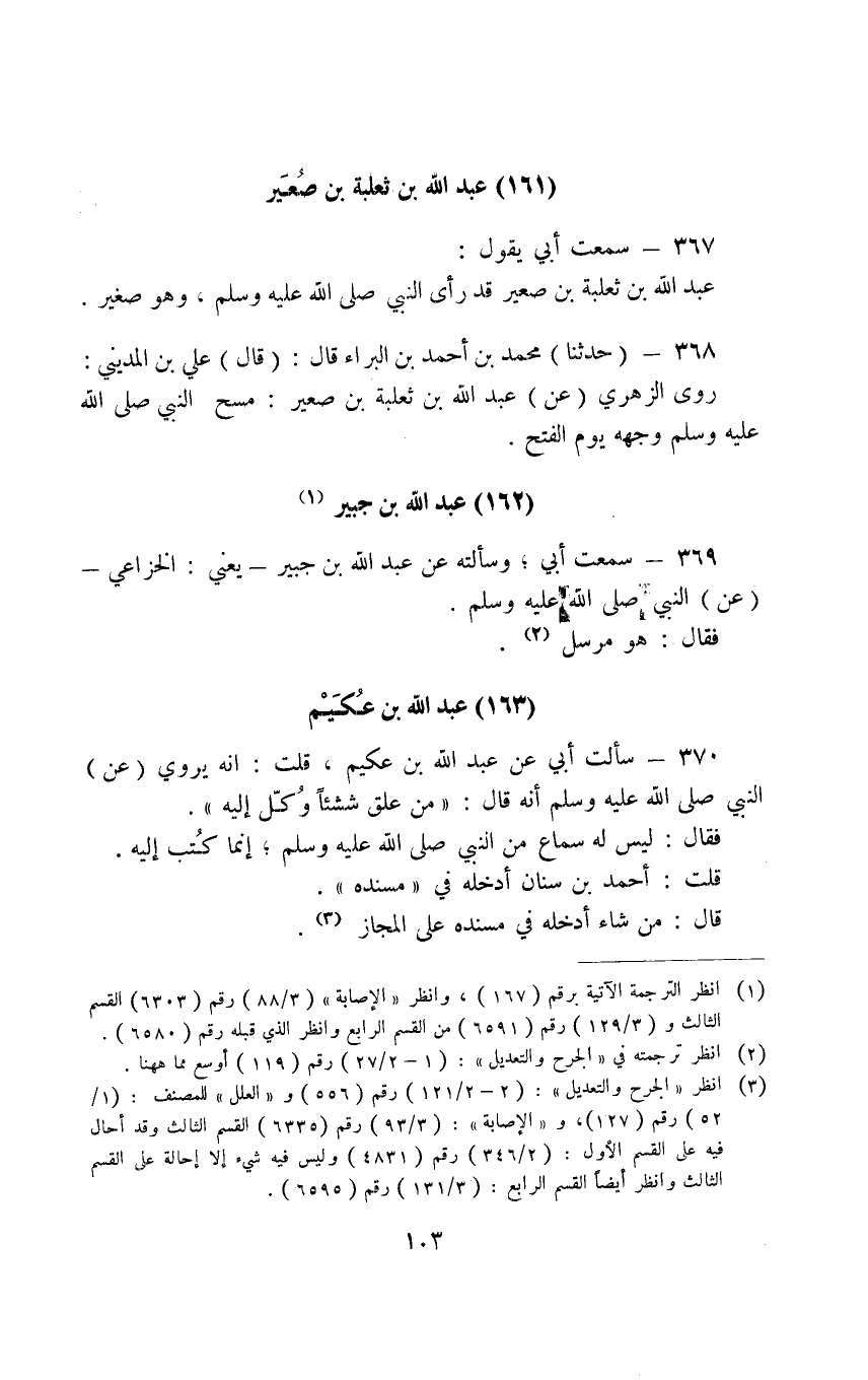 370 - سَأَلْتُ أَبِي عَنْ عَبْدِ اللَّهِ بْنِ عُكَيْمٍ قُلْتُ إِنَّهُ يَرْوِي عَنِ النَّبِيِّ صَلَّى اللَّهُ عَلَيْهِ وَسَلَّمَ أَنَّهُ قَالَ مَنْ عَلَّقَ ششئا وُكِّلَ إِلَيْهِ فَقَالَ لَيْسَ لَهُ سَمَاعٌ مِنَ النَّبِيِّ صَلَّى اللَّهُ عَلَيْهِ وَسَلَّمَ إِنَّمَا كُتِبَ إِلَيْهِ قُلْتُ أَحْمَدُ بْنُ سِنَانٍ أَدْخَلَهُ فِي مُسْنَدِهِ قَالَ مَنْ شَاءَ أَدْخَلَهُ فِي مَسْنَدِهِ عَلَى الْمَجَازِ