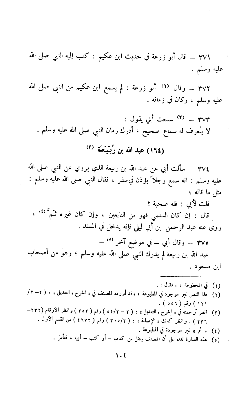 374 - سَأَلْتُ أَبِي عَنْ عَبْدِ اللَّهِ بْنِ رَبِيعَةَ الَّذِي يَرْوِي عَنِ النَّبِيِّ صَلَّى اللَّهُ عَلَيْهِ وَسَلَّم أَنَّهُ سَمِعَ رَجُلًا يُؤَذِّنُ فِي سَفَرٍ فَقَالَ النَّبِيُّ صَلَّى اللَّهُ عَلَيْهِ وَسَلَّمَ مِثْلَ مَا قَالَهُ قُلْتُ لِأَبي فَلَهُ صُحْبَةٌ قَالَ إِنْ كَانَ السَّلْمِيُّ فَهُوَ مِنَ التَّابِعِينَ وَإِنْ َكانَ غَيْرُهُ ثَمَّ رَوَى عَنْهُ عَبْدُ الرَّحْمَنِ بْنُ أَبِي لَيْلَى فَإِنَّهُ يَدْخُلُ فِي الْمُسْنَدِ