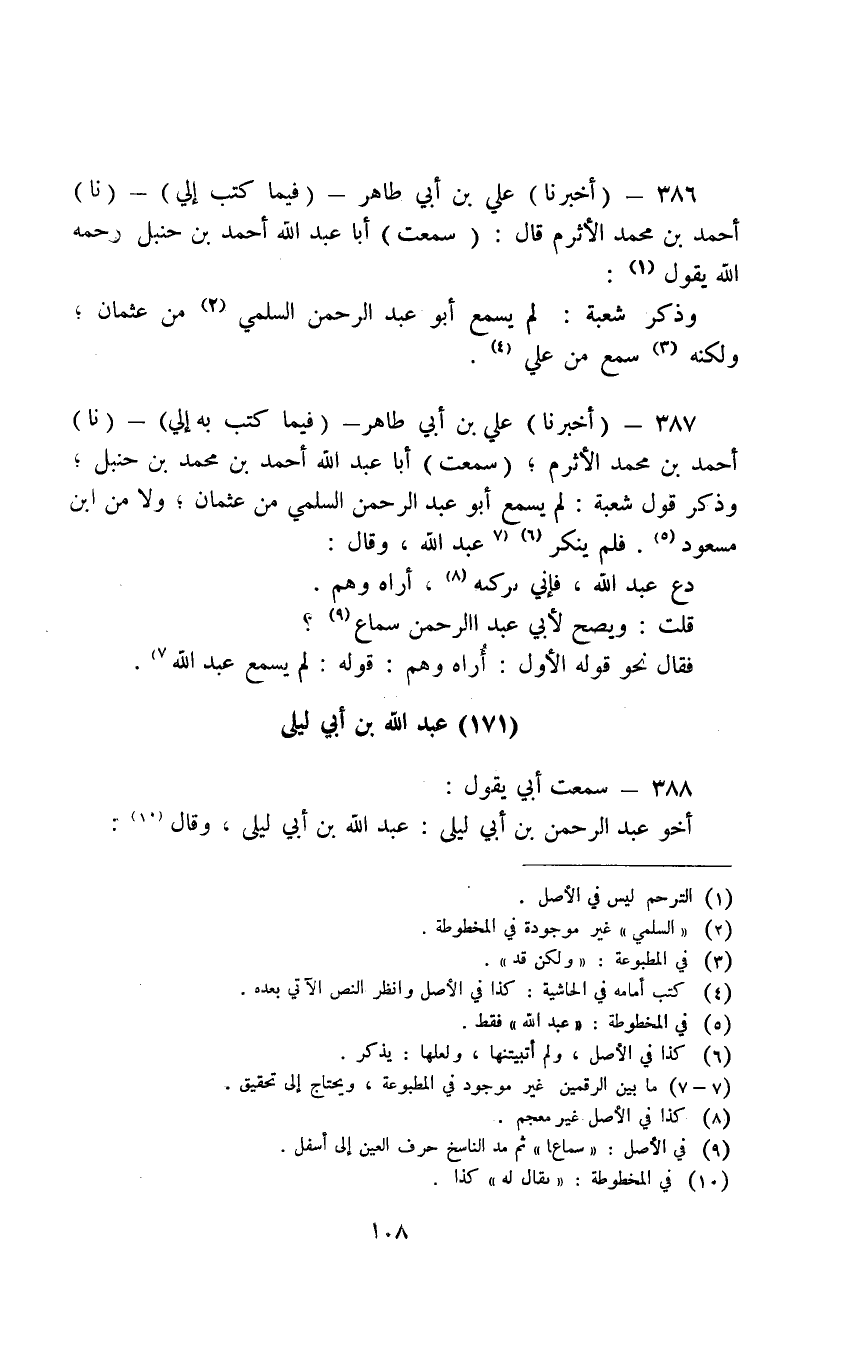 387 - أَخْبَرَنَا عَلِيُّ بْنُ أَبِي طَاهِرٍ فِيمَا كَتَبَ بِهِ إِلَيَّ نَا أَحْمَدُ بْنُ مُحَمَّدِ الْأَثْرَمُ سَمِعْتُ أَبَا عَبْدَ اللَّهِ أَحْمَدَ بْنَ مُحَمَّدِ بْنِ حَنْبَلٍ وَذَكَرَ قَوْلَ شُعْبَةَ لَمْ يَسْمَعْ أَبُو عَبْدِ الرَّحْمَنِ السَّلَمِيُّ مِنْ عُثْمَانَ وَلَا ِمْن ابْنِ مَسْعُودٍ فَلَمْ يَنْكُرْ عَبْدَ اللَّهِ وَقَالَ دَعْ عَبْدَ اللَّهِ فَإِنِّي تَرَكْتُهُ أَرَاهُ وَهَمٌ قُلْتُ وَيَصِحُّ لِأَبِي عَبْدِ الرَّحْمَنِ سَمَاعٌ فَقَالَ نَحْوَ قَوْلِهِ الْأَوْلِ أَرَاهُ وَهَمٌ قَوْلُهُ لَمْ يَسْمَعْ عَبْدُ اللَّهِ