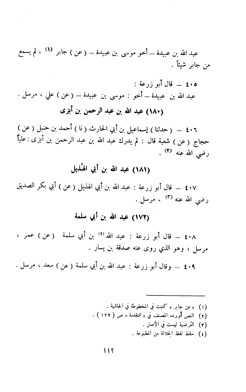 405 - قَالَ أَبُو زُرْعَةَ عَبْدُ اللَّهِ بْنُ عُبَيْدَةَ أَخُو مُوسَى بْنِ عُبَيْدَةَ عَنْ عَلِيٍّ مُرْسَلٌ