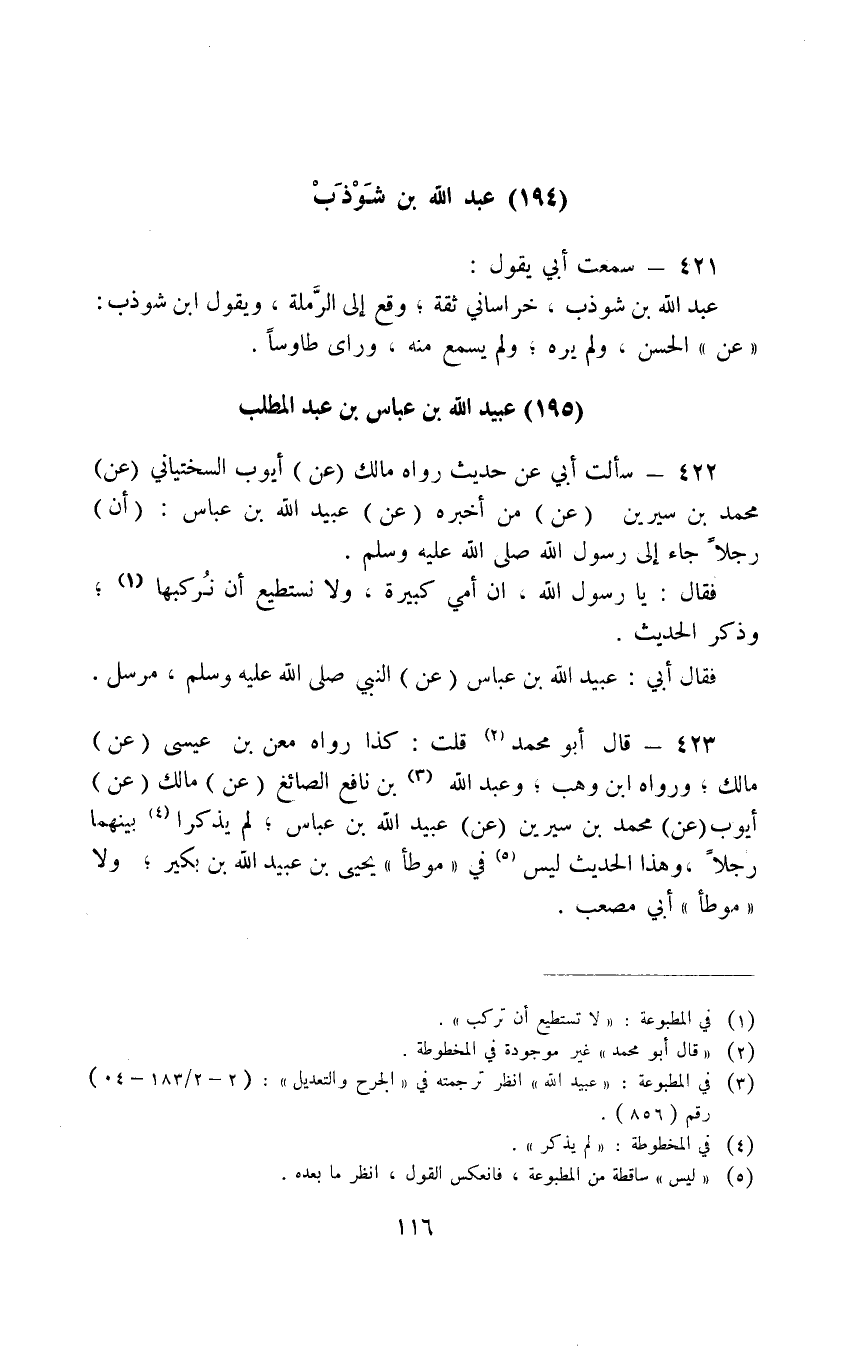 421 - سَمِعْتُ أَبِي َيُقوُل عَبْدُ اللَّهِ بْنُ شَوْذَبٍ خُرَاسَانِيٌّ ثِقَةٌ وَقَعَ إِلَى الرَّمْلَةِ وَيَقُولُ ابْنُ شَوْذَبٍ عَنِ الْحَسَنِ وَلَمْ يَرَهُ وَلَمْ يَسْمَعْ مِنْهُ وَرَأى طاوسا