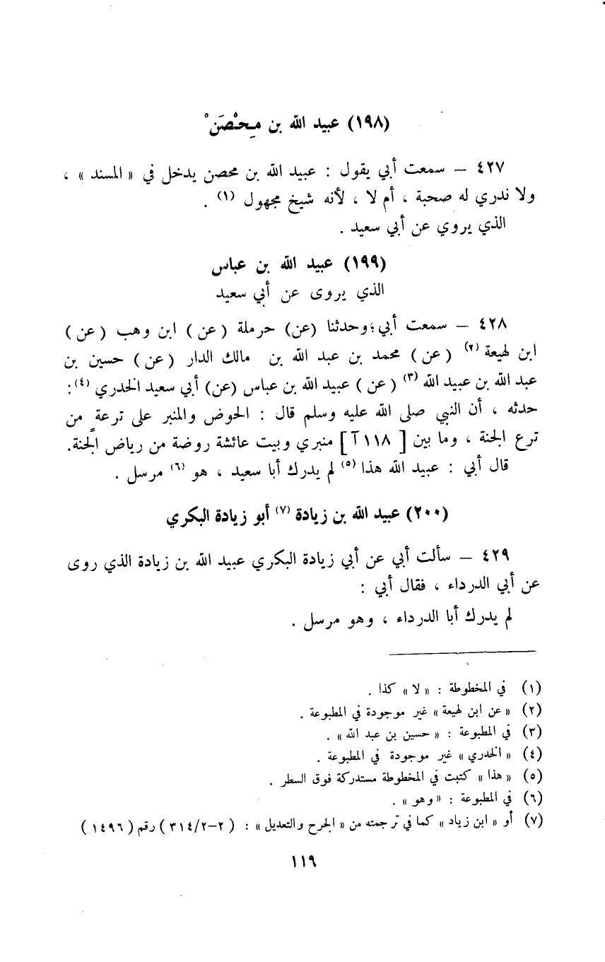 427 - سَمِعْتُ أَبِي يَقُولُ عبيد الله بْنُ مِحْصَنٍ يَدْخُلُ فِي الْمُسْنَدِ وَلَا نَدْرِي لَهُ صُحْبَةٌ أَمْ لَا لِأَنَّهُ شَيْخٌ مَجْهُولٌ الَّذِي يروي عَن أبي سعيد