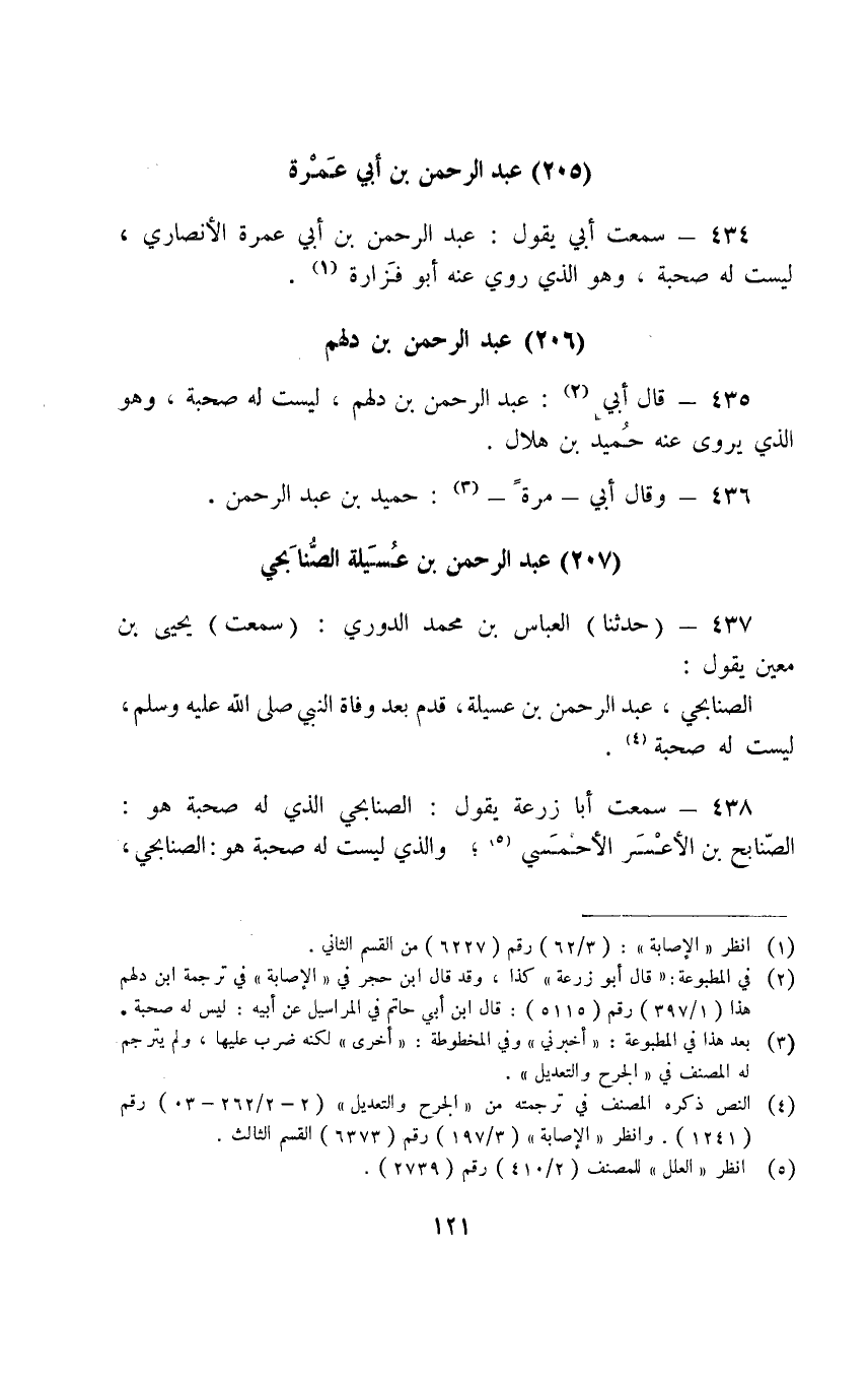 438 - سَمِعْتُ أَبَا زُرْعَةَ يَقُولُ الصُّنَابِحِيُّ الَّذِي لَهُ صُحْبَةٌ هُوَ الصُّنَابِحُ بْنُ الْأَعْسَرِ الْأَحْمَسِيُّ وَالَّذِي لَيْسَتْ لَهُ صُحْبَةٌ هُوَ الصُّنَابِحِيُّ وَاسْمُهُ عَبْدُ الرَّحْمَنِ بْنُ عُسَيْلَةَ قَدِمَ عَلَى النَّبِيِّ صَلَّى اللَّهُ عَلَيْهِ وَسَلَّمَ فَلَمْ يَلْحَقُهُ تُوُفِّيَ النَّبِيُّ صَلَّى اللَّهُ عَلَيْهِ وَسَلَّمَ وَهُوَ بِالْجُحْفَةِ