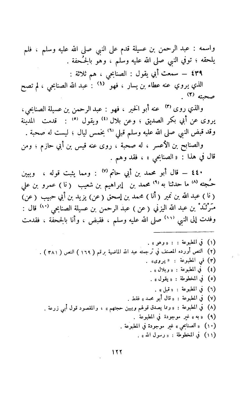 439 - سَمِعْتُ أَبِي يَقُولُ الصُّنَابِحِيُّ هُمْ ثَلَاثَةٌ الَّذِي يَرْوِي عَنْهُ عَطَاءُ بْنُ يَسَارٍ فَهُوَ عَبْدُ اللَّهِ الصُّنَابِحِيُّ لَمْ تَصِحْ صُحْبَتُهُ وَالَّذِي رَوَى عَنْهُ أَبُو الْخَيْرِ فَهُوَ عَبْدُ الَّرْحَمِن بْنُ عُسَيْلَةَ الصُّنَابِحِيُّ يَرْوِي عَنْ أَبِي بَكْرٍ الصِّدِّيقِ وَعَنْ بِلَالٍ وَيقَوُل قَدِمْتُ الْمَدِينَةَ وَقَدْ قُبِضَ النَّبِيِّ صَلَّى اللَّهُ عَلَيْهِ وَسَلَّم قَبْلِي بِخَمْسِ لَيَالٍ لَيْسَتْ لَهُ صُحْبَةٌ وَالصُّنَابِحُ بْنُ الْأَعْسَرِ لَهُ صُحْبَةٌ رَوَى عَنْهُ قَيْسُ بْنُ أَبِي حَازِمٍ وَمَنْ قَالَ فِي هَذَا الصُّنَابِحِيُّ فَقَدْ وُهِمَ