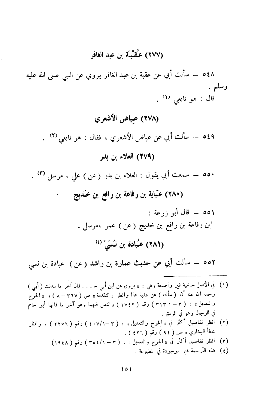 548 - سَأَلْتُ أَبِي عَنْ عُقْبَةَ بْنِ عَبْدِ الْغَافِرِ يَرْوِي عَنِ النَّبِيِّ صَلَّى اللَّهُ عَلَيْهِ وَسَلَّمَ قَالَ هُوَ تَابِعٌّي